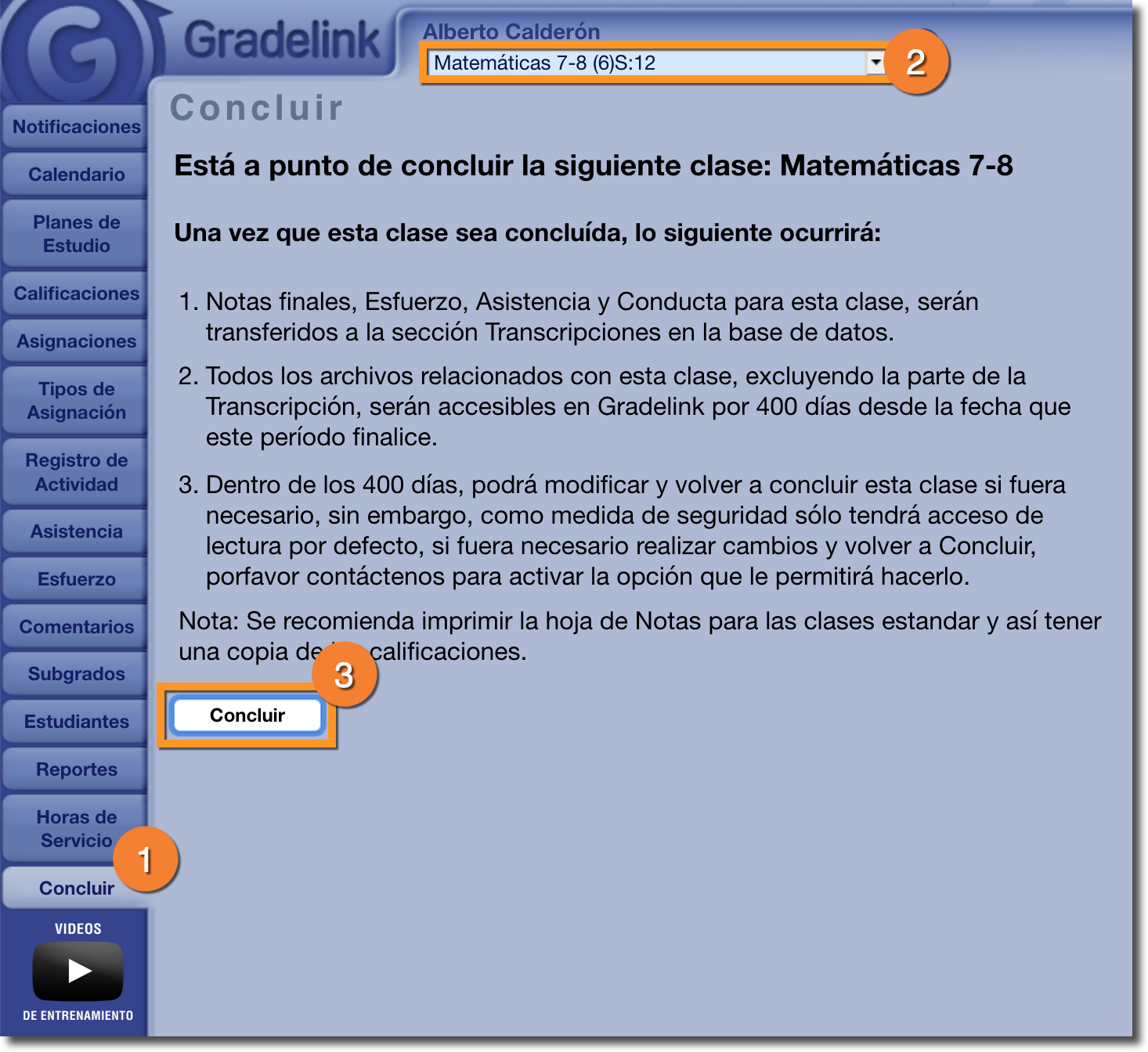 IMPORTANTE: Una vez que una clase ha concluido, los maestros ya no pueden realizar ningún cambio desde la sección calificaciones. Si es necesario realizar algún cambio, consulte al Administrador de su escuela.