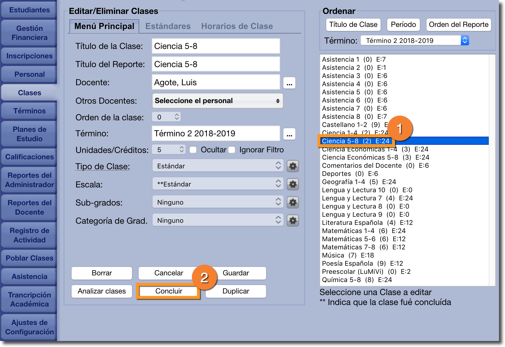 Como administrador, usted puede concluir las clases de forma individual navegando primero a la pestaña Clases en la barra lateral izquierda.