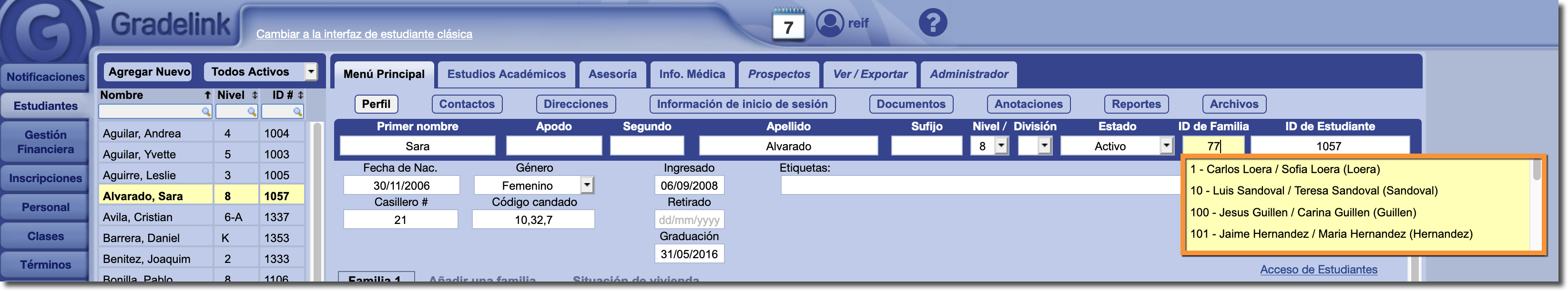 Por defecto, cada cuenta de estudiante tiene una identificación familiar única. Todo lo que necesita hacer para vincular a los hermanos es reemplazar la ID de Familia de un estudiante con la ID de Familia de otro estudiante.