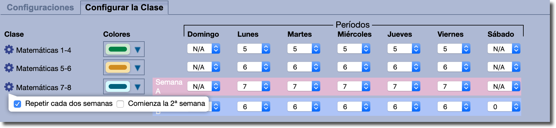 Si hace clic en el icono de engranaje junto a sus nombres puede activar el formato 'Quincenal', que permite que las clases alternen entre diferentes configuraciones. Las clases configuradas para usar el formato 'Quincenal' incluirán una "Semana A" y "Semana B" en el cuadro de períodos de la derecha. De forma predeterminada, las clases quincenales se alternan entre "Semana A" y "Semana B", pero las clases quincenales también pueden configurarse para comenzar con "Semana B" en su lugar.