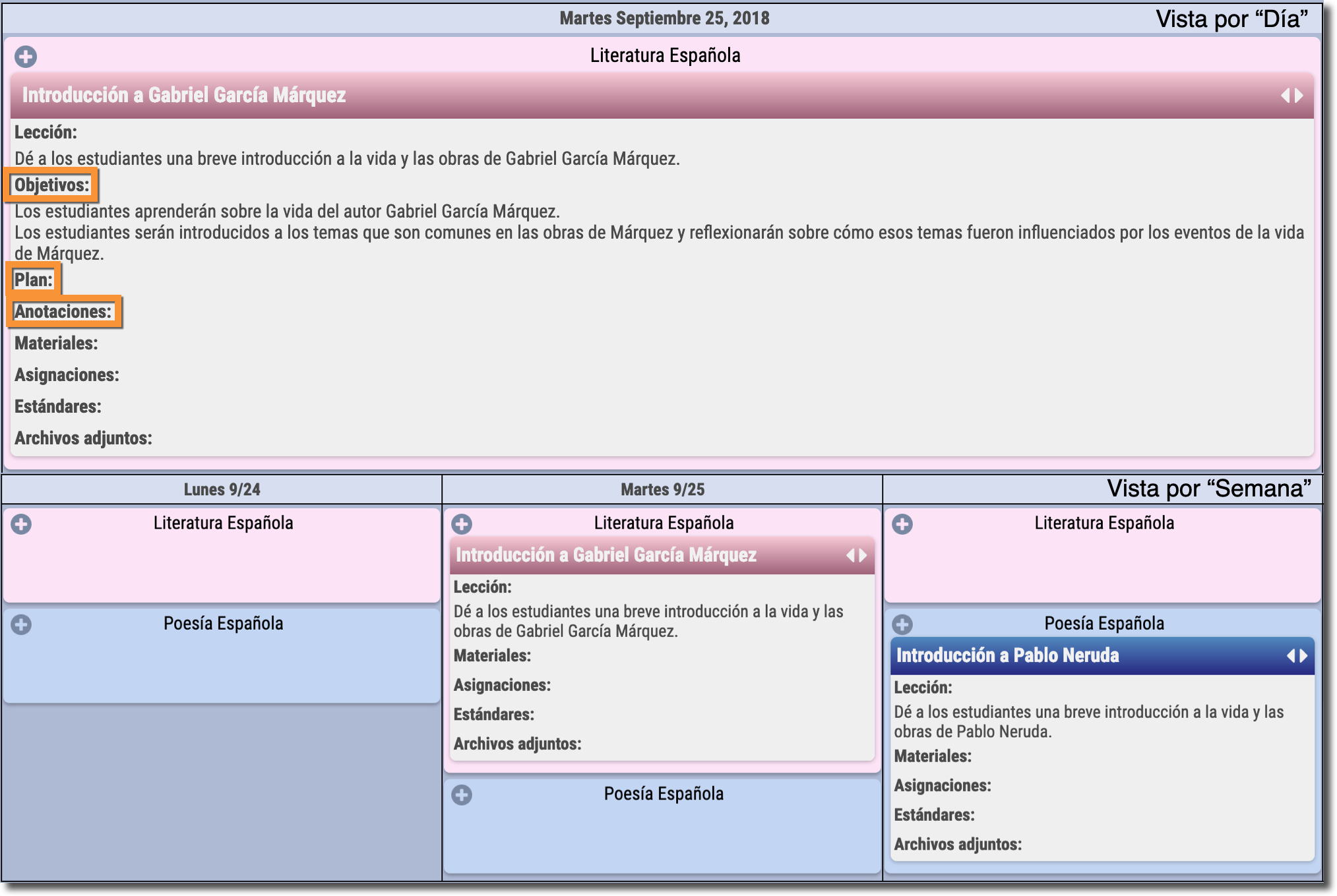 En el ejemplo que se muestra arriba, los elementos "Objetivos", "Plan" y "Anotaciones" están configurado para aparecer en la vista por día pero no en la vista por semana.