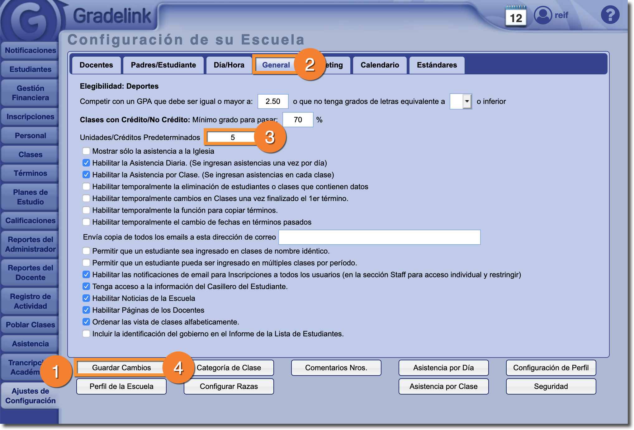 Sin embargo, agregar unidades / créditos manualmente para cada clase en un término puede llevar mucho tiempo, especialmente si m uchas clases comparten la misma cantidad de unidades / créditos. Es por eso que Gradelink permite a los administradores establecer unidades / créditos predeterminados en la pestaña Ajustes de Configuración.