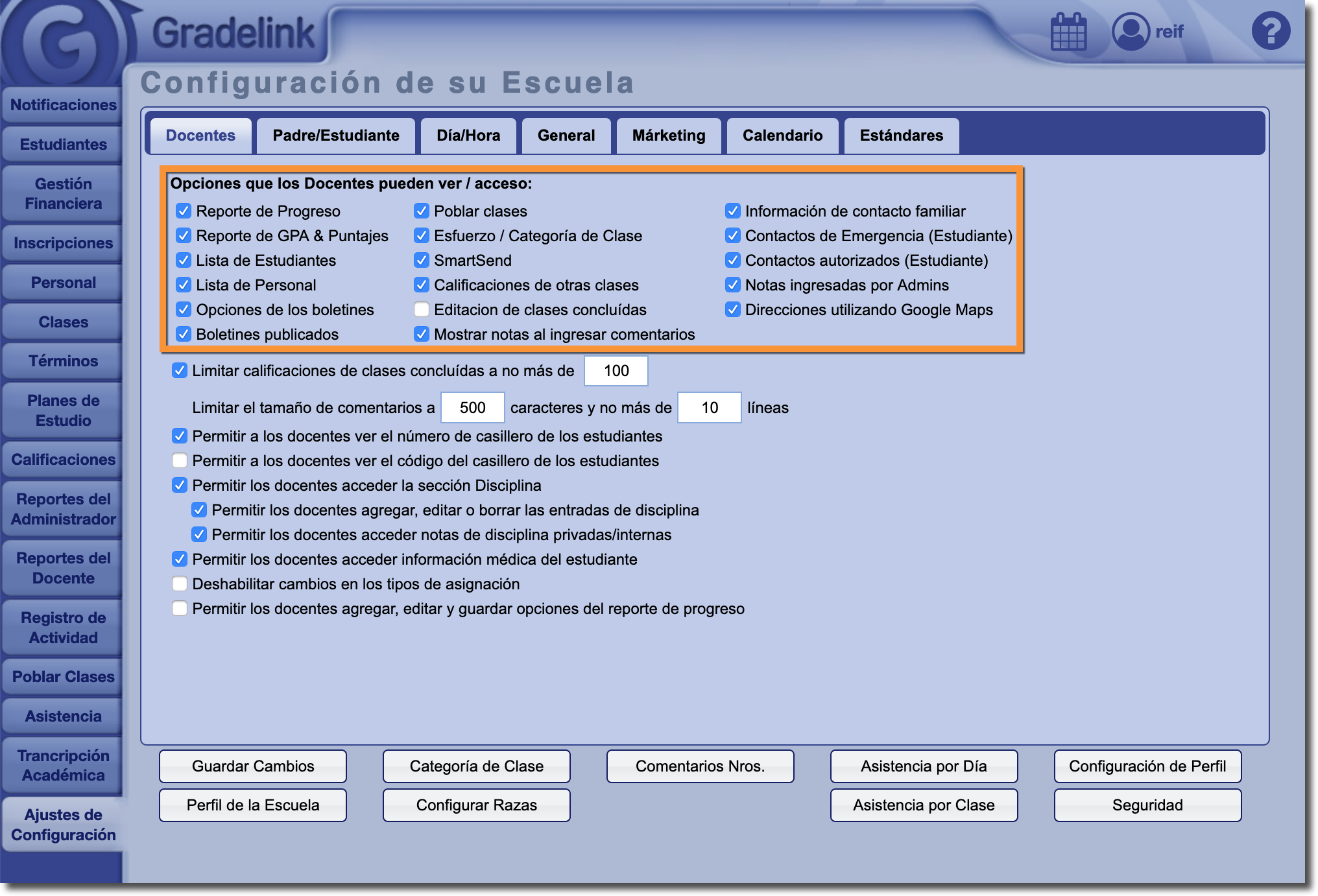 En la subpestaña Docentes de la pestaña Ajustes de Configuración, los administradores pueden controlar a qué áreas de Gradelink los docentes tienen acceso.