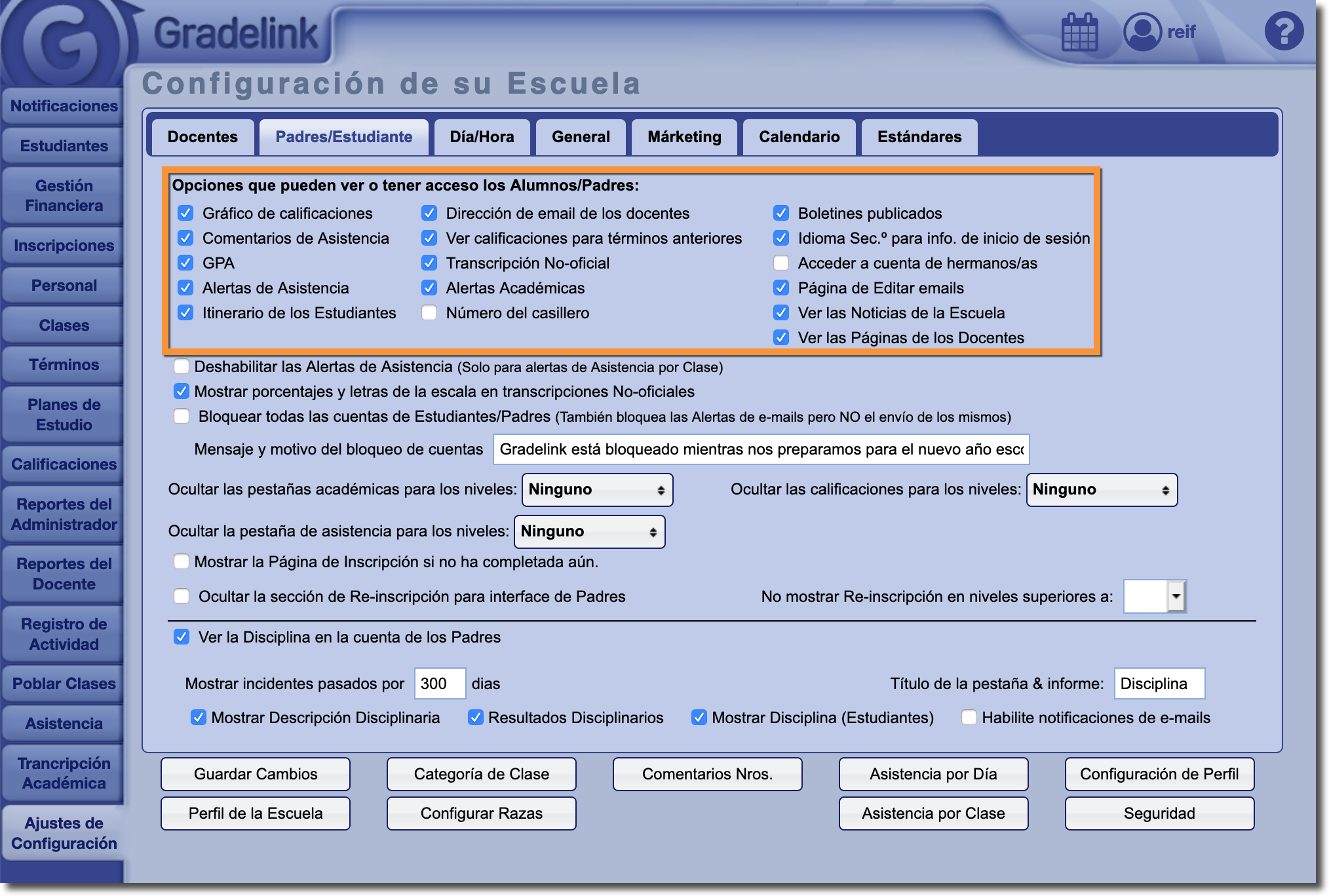 En la sección Padres / Estudiantes de la pestaña Ajustes de Configuración, los administradores pueden controlar a qué áreas de Gradelink padres y estudiantes tienen acceso.