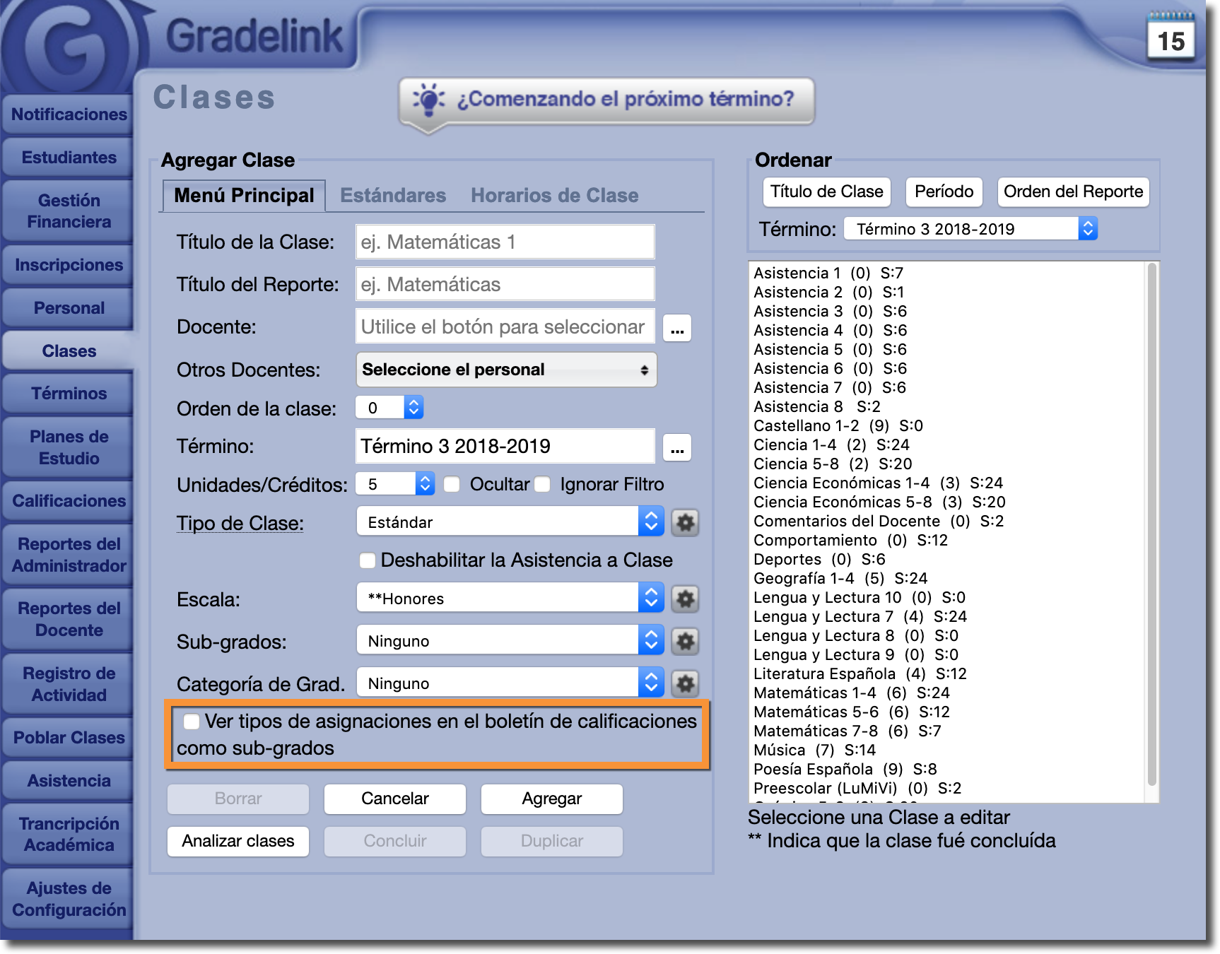Si desea incluir los Tipos de Asignación en el boletín, comuníquese con el personal de Gradelink para habilitar la función para su escuela. Una vez que la función está habilitada, puede activarla en la pestaña Clases: