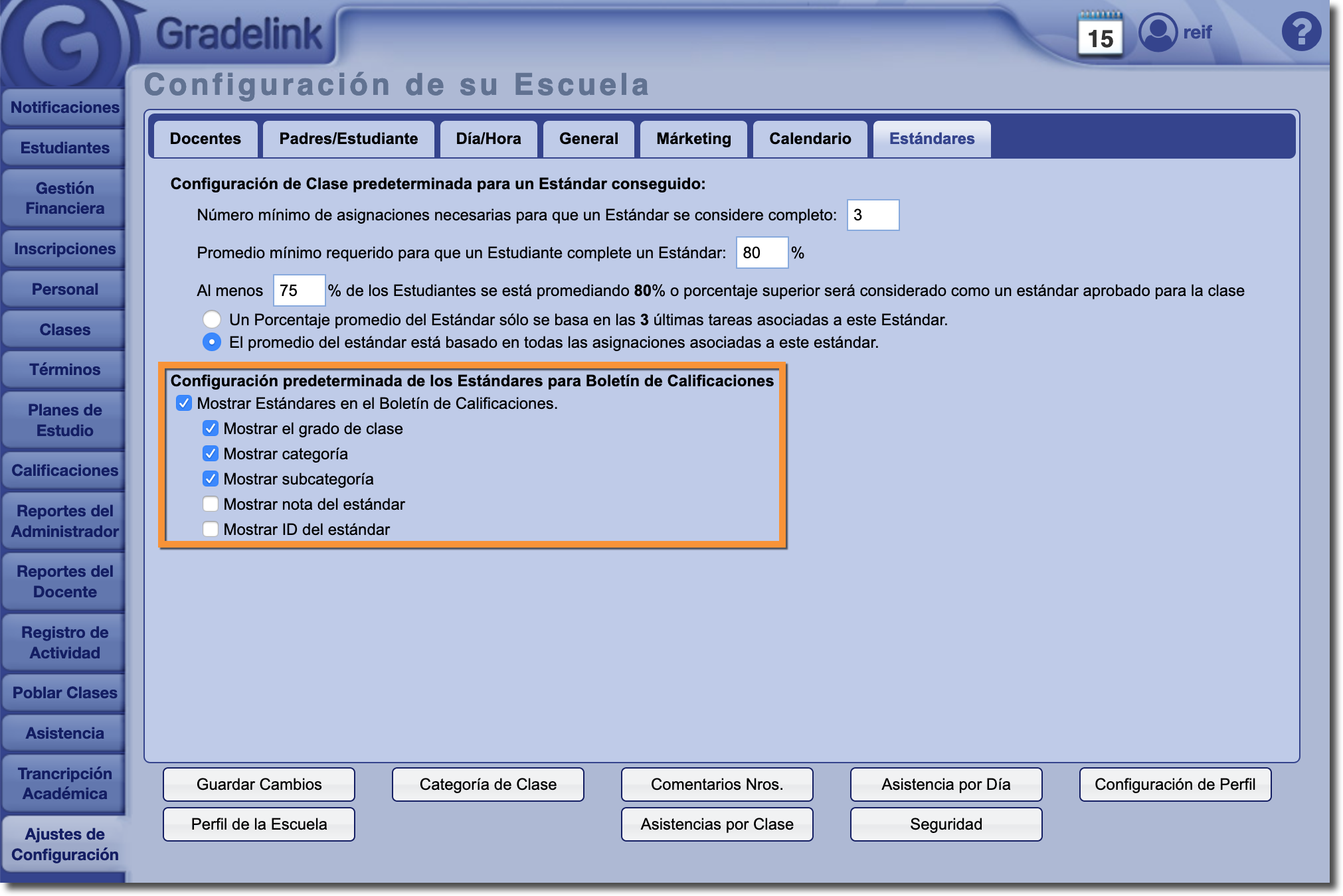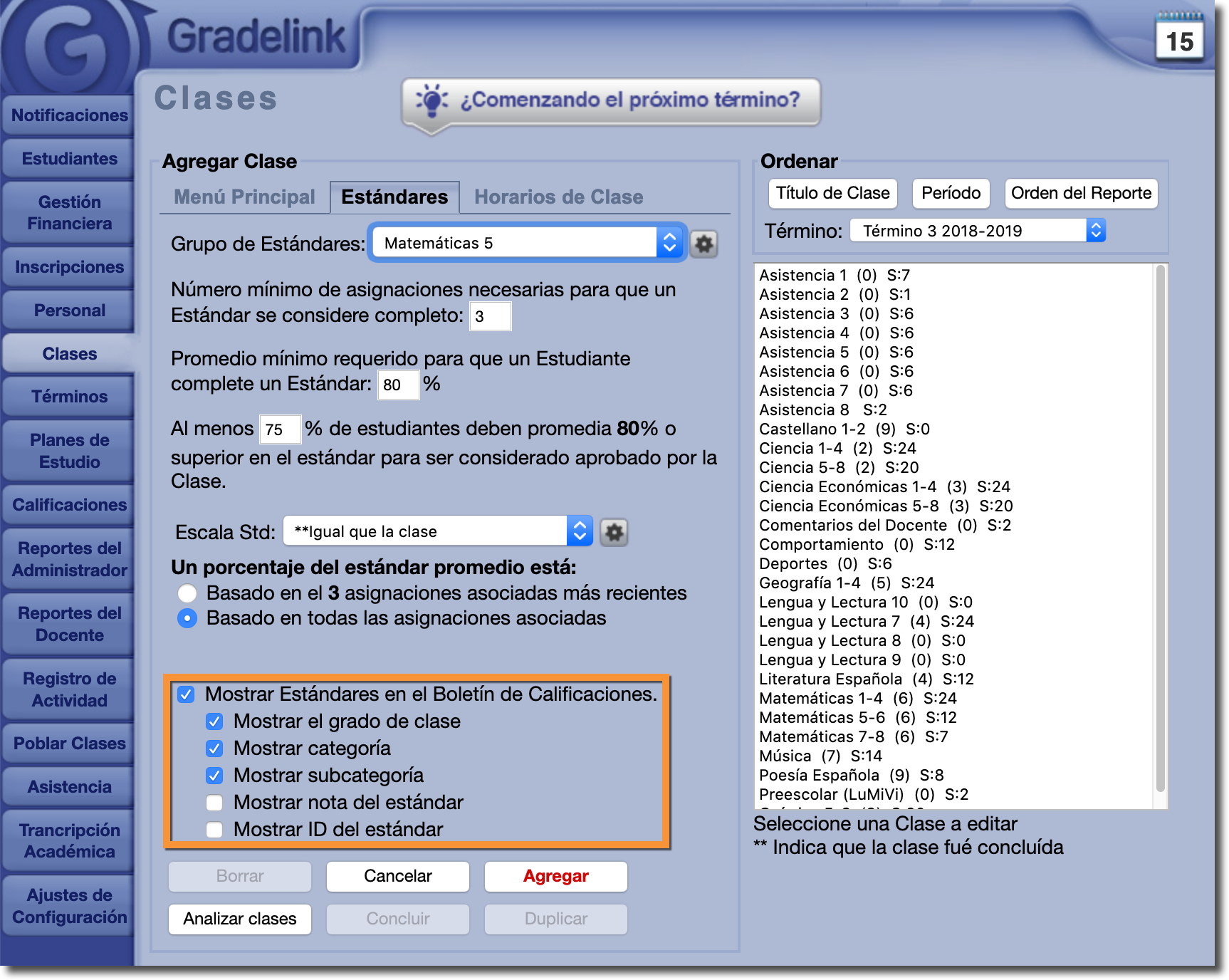 Normalmente, los administradores determinarán si deben incluirse los estánadares en los boletines de calificaciones por clase al abilitar o desabilitar ciertas configuraciones en la sección de Estándares de la pestaña Clases.