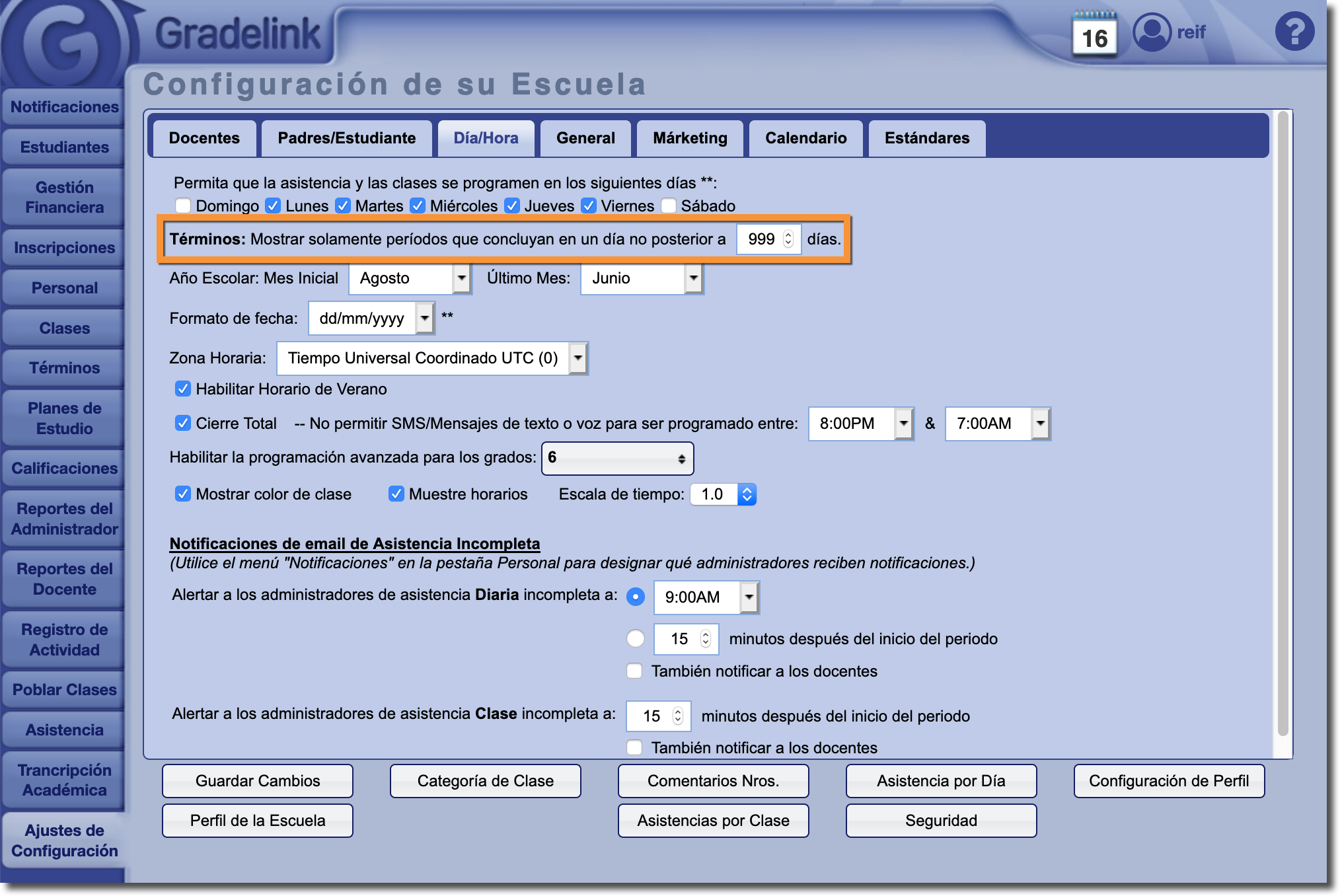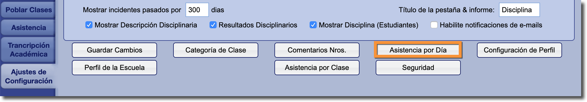 Para modificar la apariencia de los valores de asistencia escolar/diaria en el boletín de calificaciones, haga clic en "Asistencia por Día" en la pestaña Ajustes de Configuración: