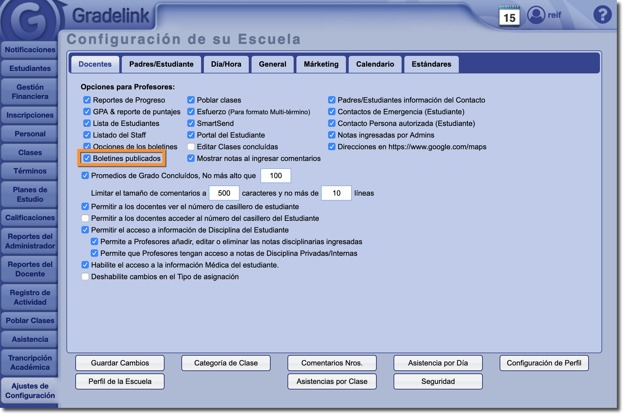 Los administradores pueden otorgar a los maestros acceso a estas funciones al marcar la casilla "Opciones de los boletines" en la sección Docente de la pestaña Ajustes de Configuración:
