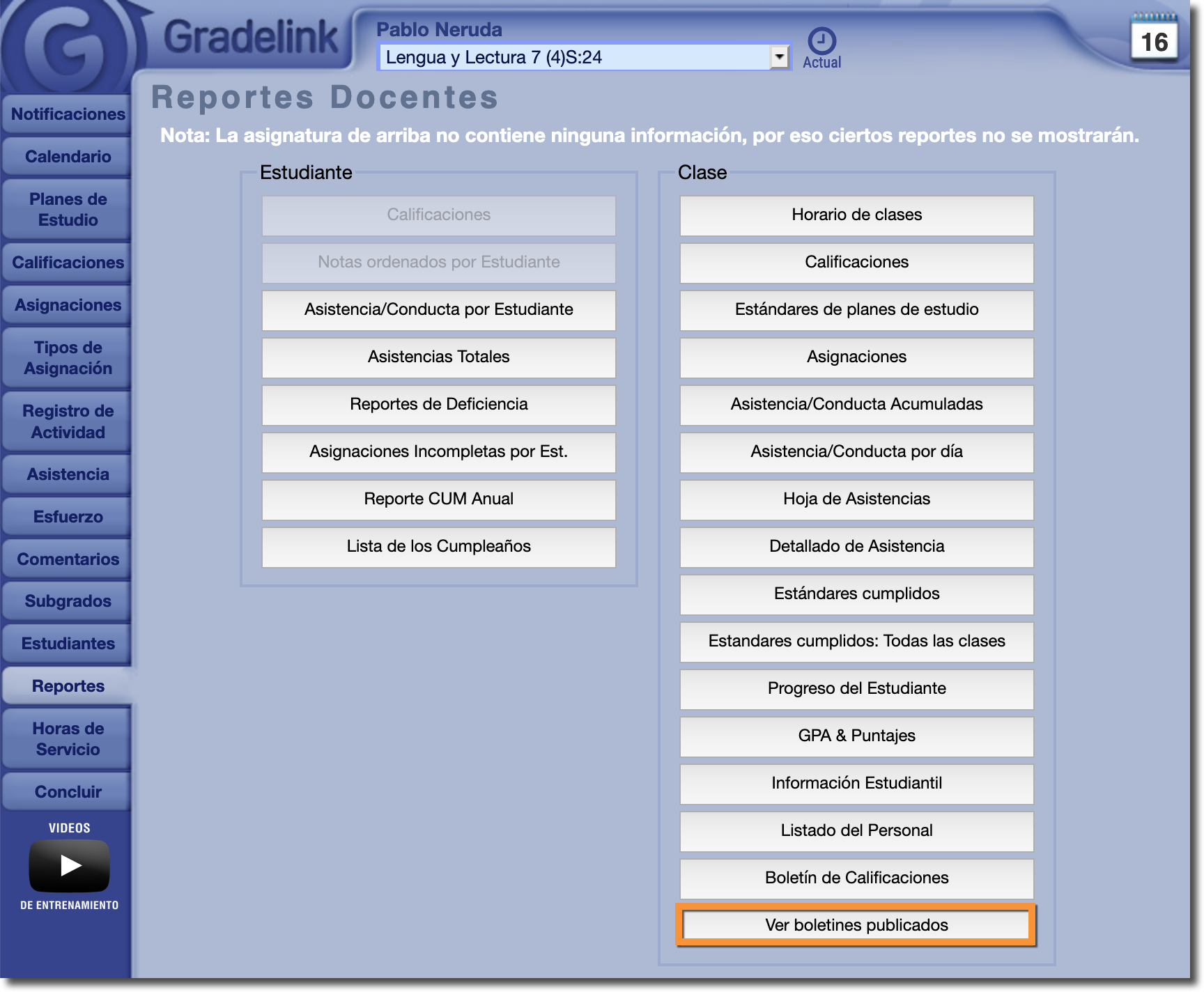 Cuando esta configuración esté activa, los profesores verán un nuevo botón con la etiqueta "Ver boletines publicados" en la pestaña Reportes.