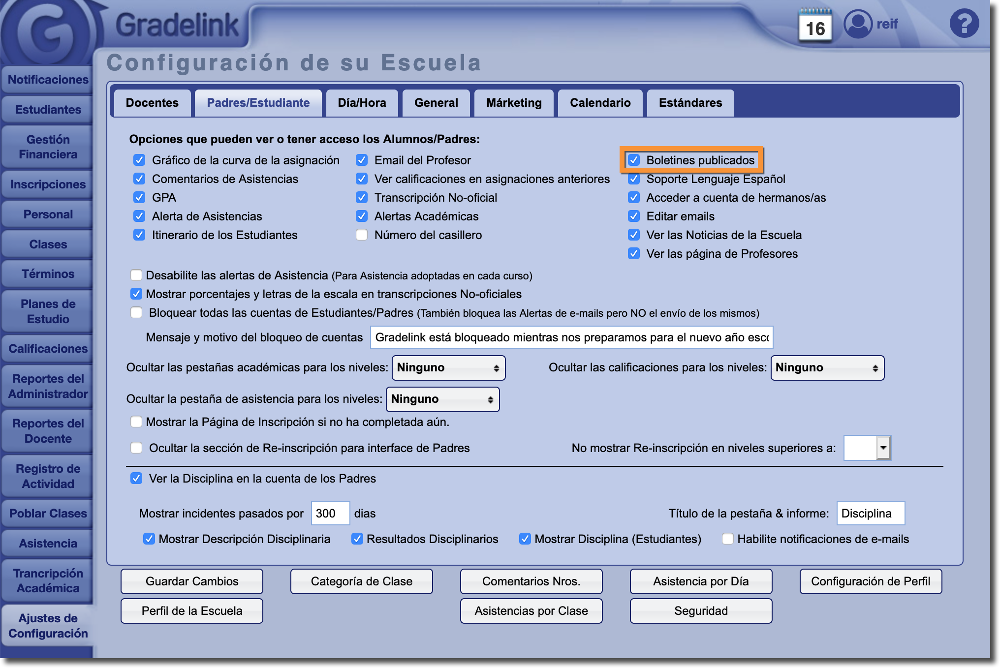 Si las escuelas desean poner a disposición de los padres y estudiantes los boletines de calificaciones a través de Gradelink, pueden hacerlo activando la configuración de "Boletines publicados" en la sección Padres/Estudiantes de la pestaña Ajustes de Configuración: