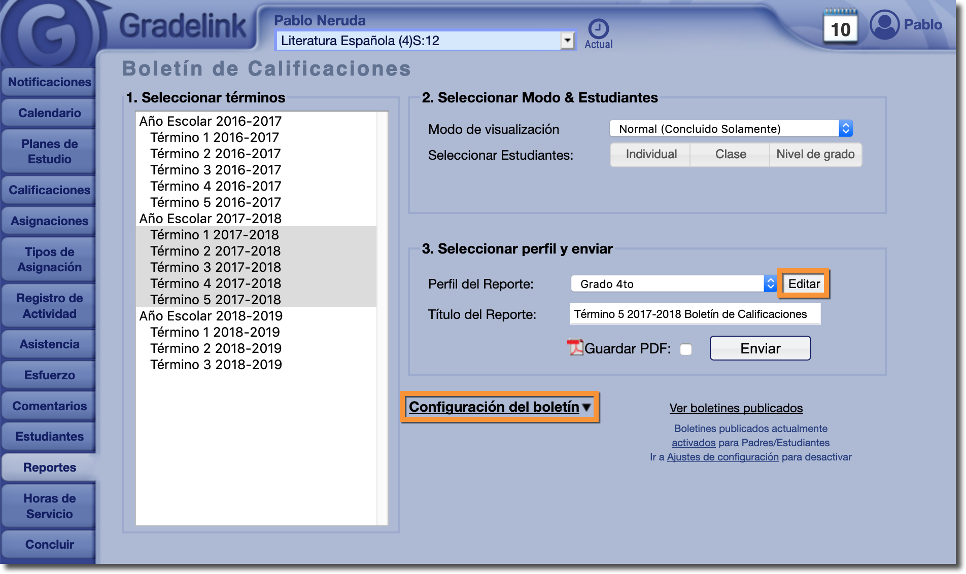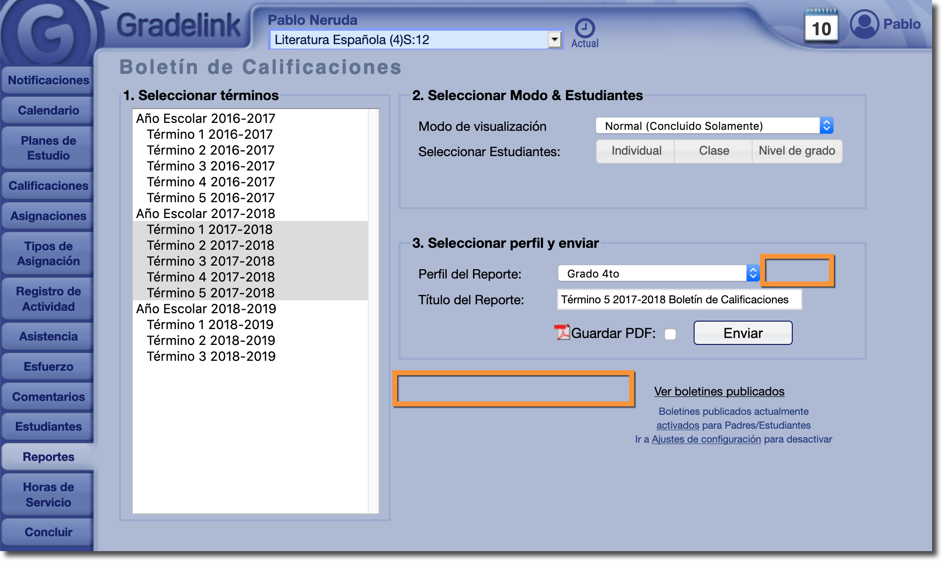 Generación de boletines de calificaciones para Términos pasados