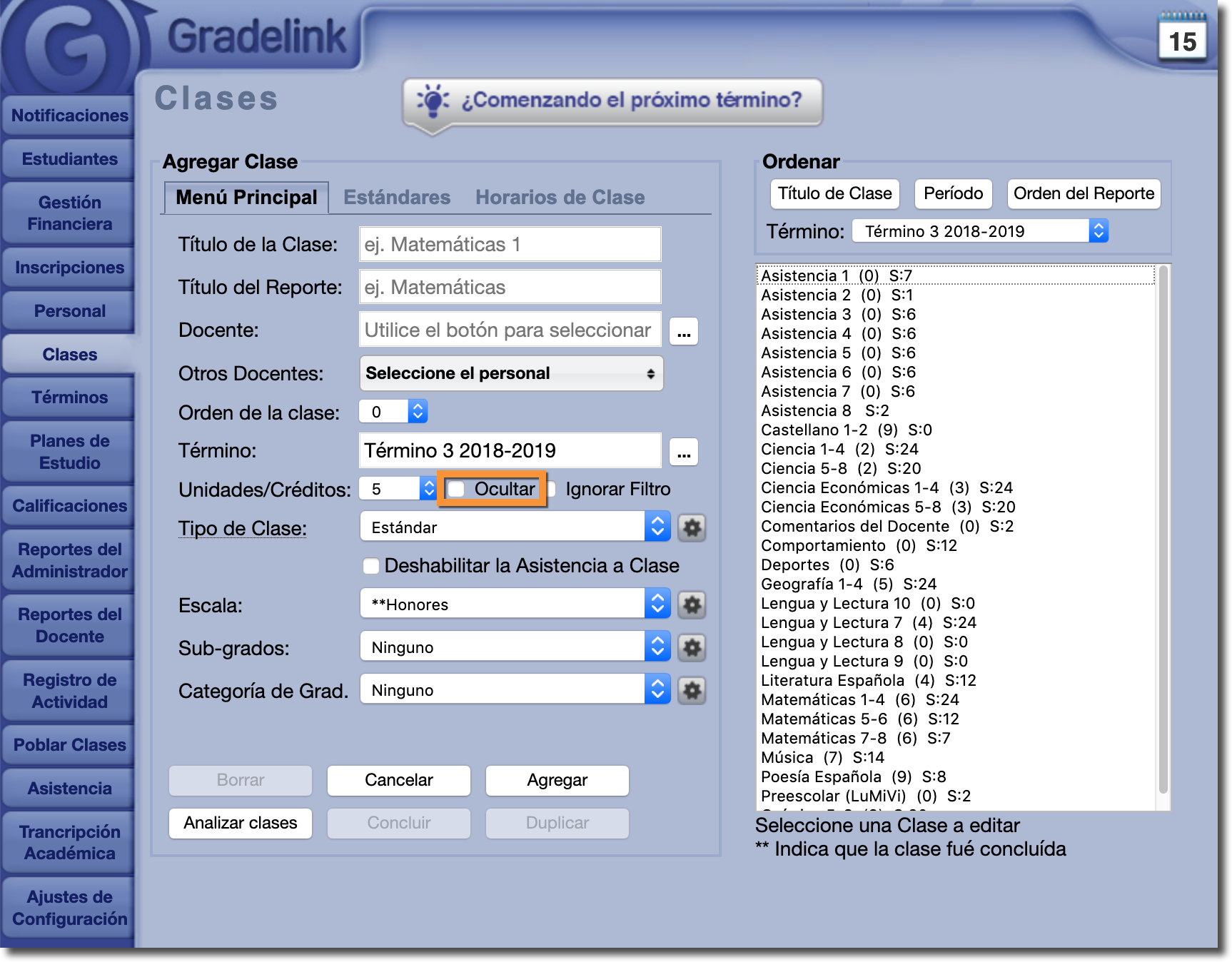 Si desea utilizar clases ocultas, comuníquese con el personal de Gradelink para habilitar la función para su escuela. Una vez que la función está habilitada, puede marcar clases como "oculto" en la pestaña Clases: