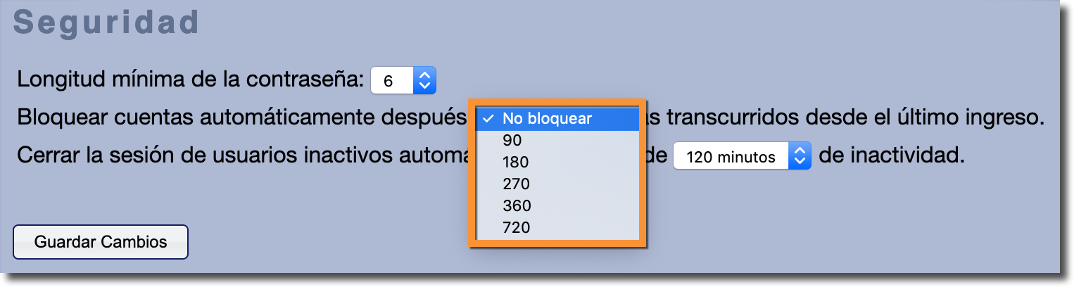 Bloquear automáticamente las cuentas después... le dice a Gradelink que bloquee automáticamente las cuentas de los estudiantes y el personal si no se han registrado durante un cierto período de tiempo.