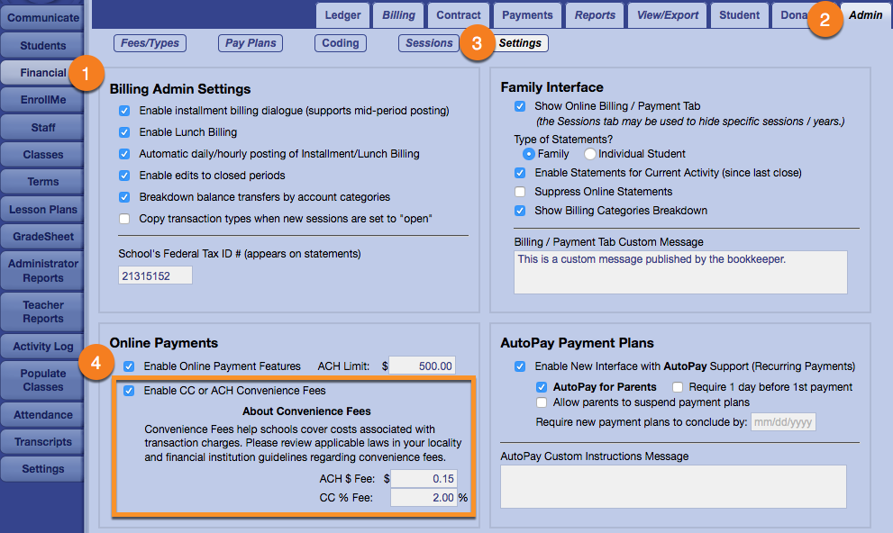 Convenience Fees Convenience Fees Financial2. Click on the Admin sub-tab.3. Select the Settings button. 4. Check the check box of, "Enable CC or ACH Convenience Fees". Apply the appropriate fees.
