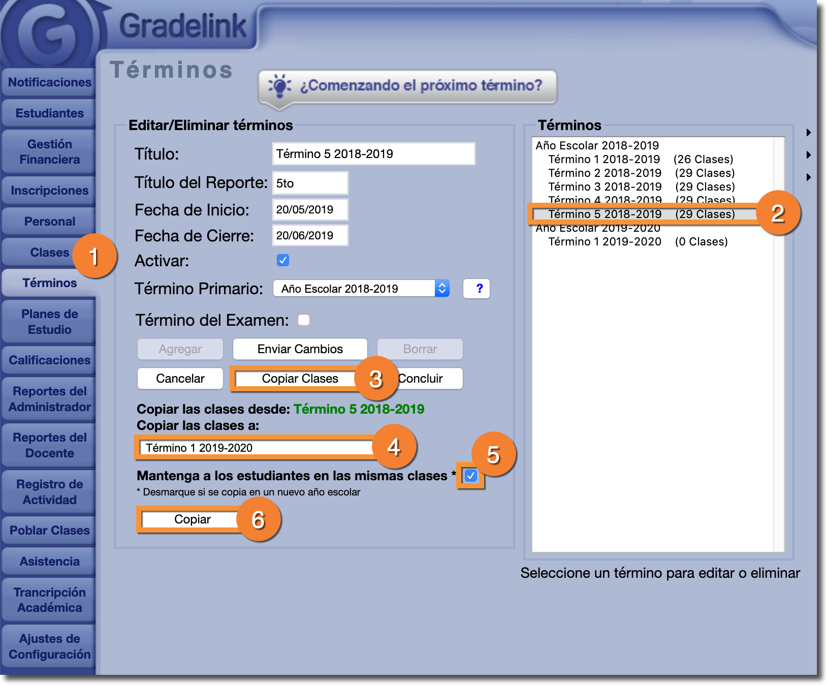 Si su escuela tiene una gran cantidad de clases en cada Término, es mucho más rápido y fácil copiar las clases de un término anterior y luego hacer los cambios necesarios.