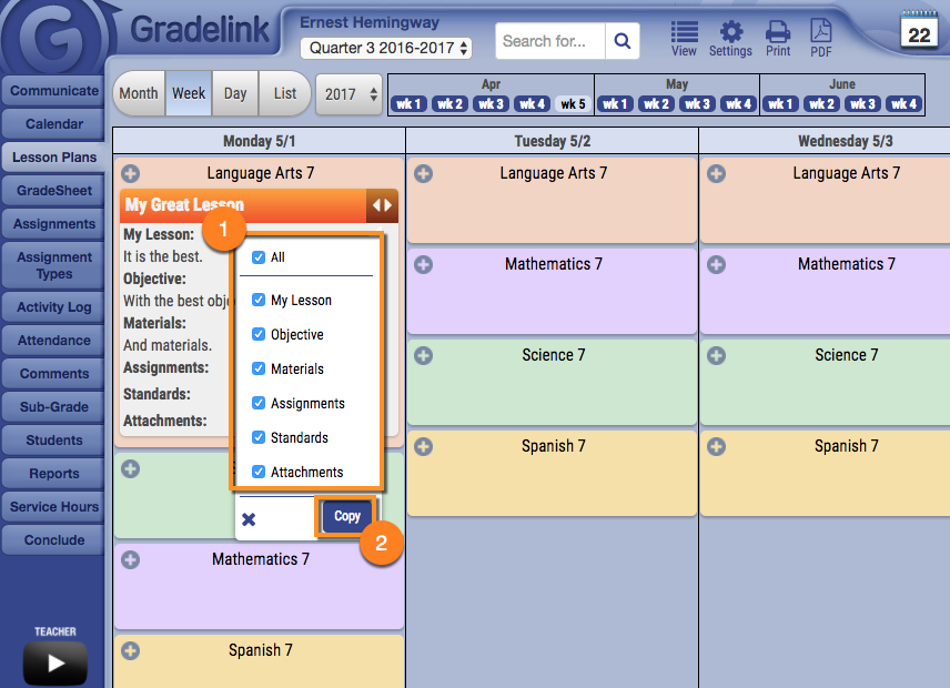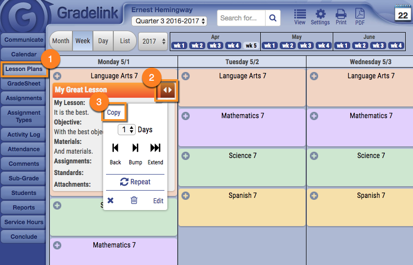 Gradelink gives Teachers the ability to make a copy of an existing Lesson Plan then paste it on another date.