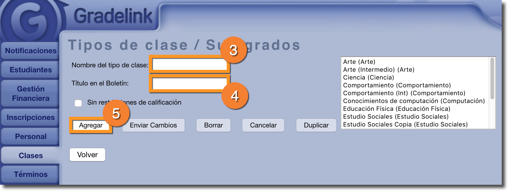 3. En el campo "Nombre del tipo de clase", ingrese un título para la Clase para la que desea crear Sub-grados. Este nombre se utiliza en el menú desplegable Sub-Grados y no se imprime en ningún lugar . Gradelink recomienda ingresar el título de la clase y las calificaciones para las que se usará la clase, es decir, "Ética laboral 4-5" o "Comportamiento K-6".