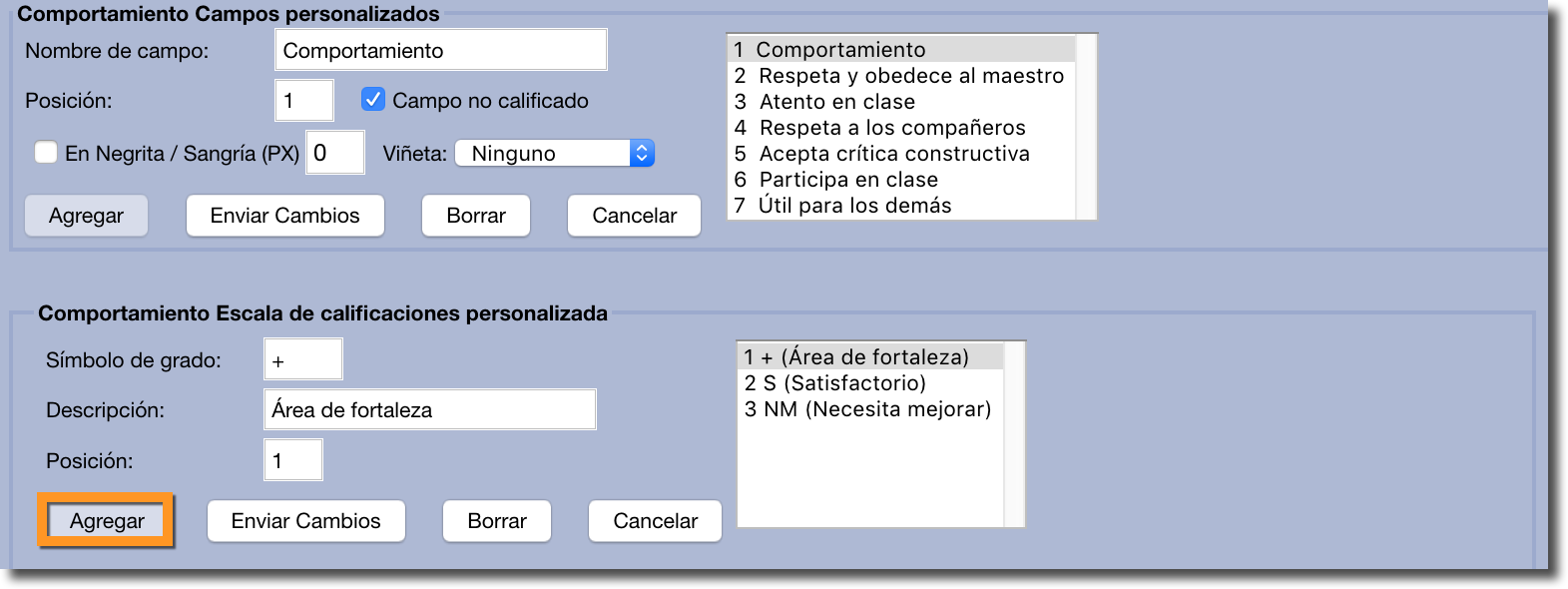 Se puede configurar cualquier escala de calificación (es decir, ABCDF, OGSN, etc.) y aparecerán en los boletines de calificaciones, pero no aparecerán en las transcripciones o informes de progreso.