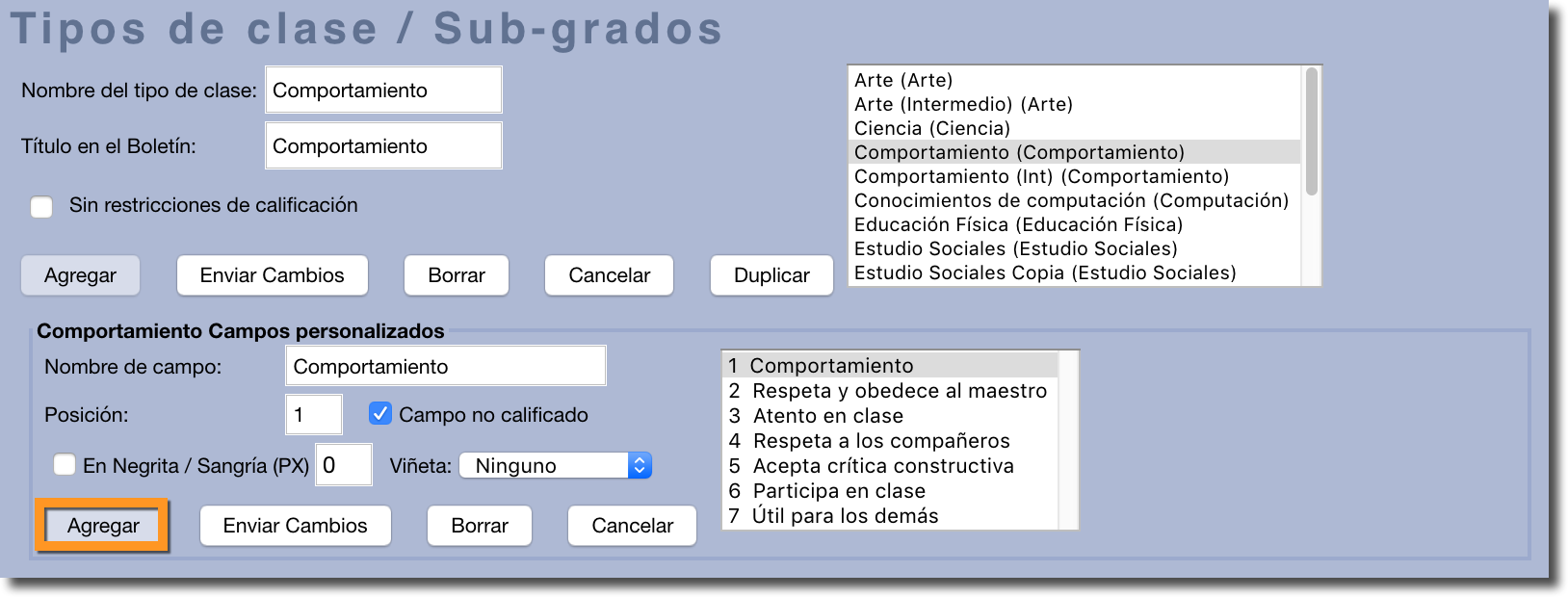 • Nombre del tipo de clase es el título que aparecerá como una fila individual en las boletas de calificaciones. Los nombres de los campos bajo "Ética laboral" pueden incluir "Participación", "Trabajo en equipo", "Eficiencia", etc.