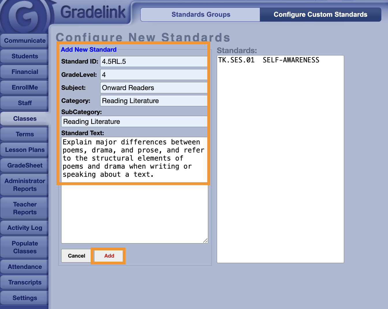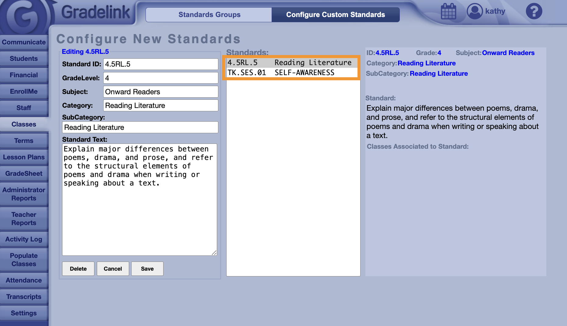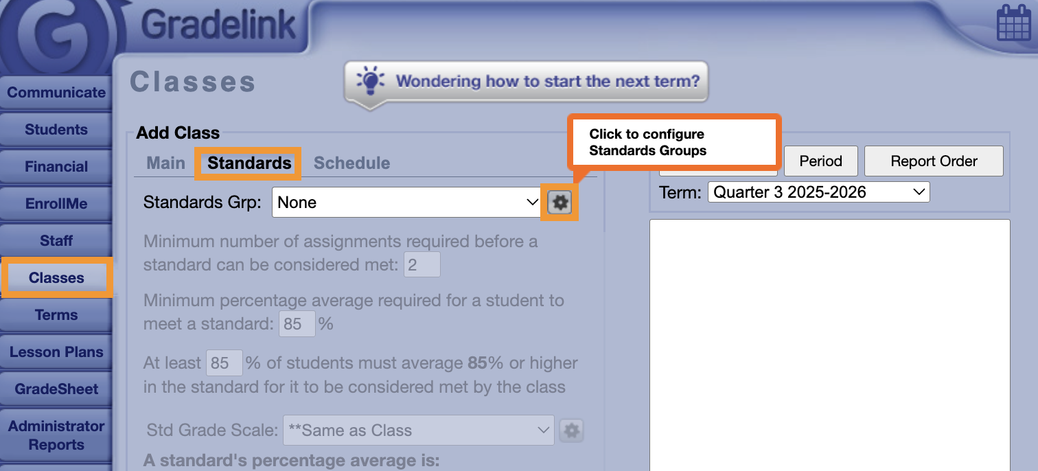 1. Click on the Classes tab and click the Standards tab.