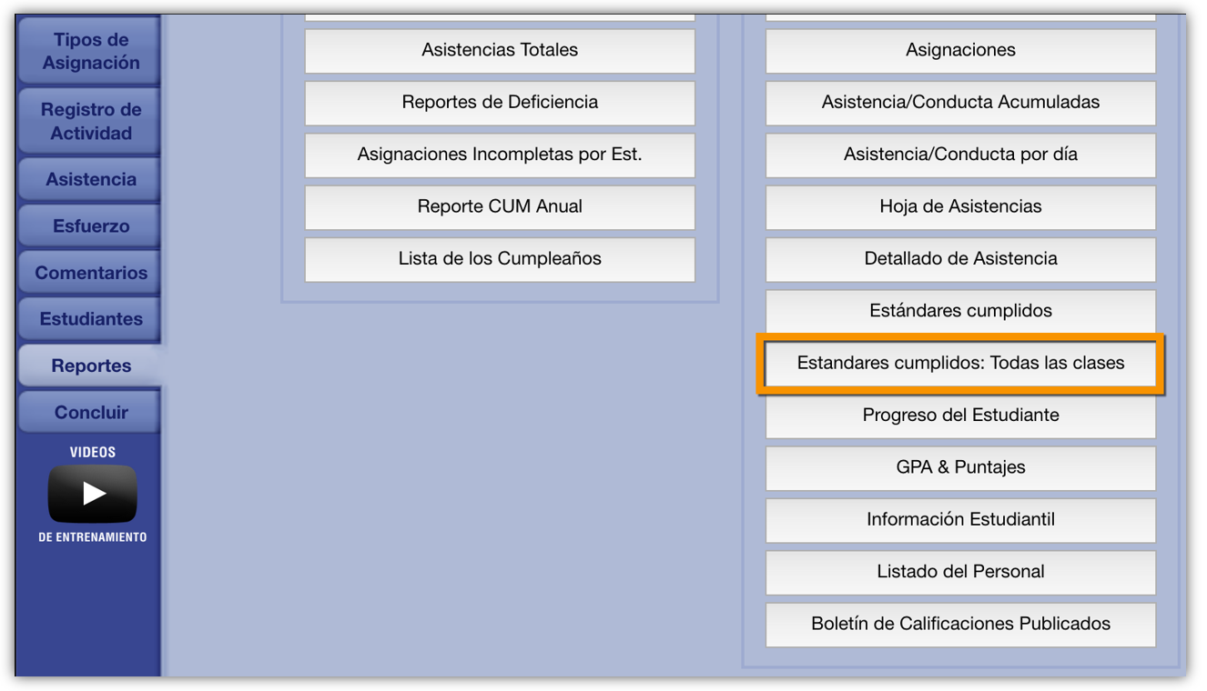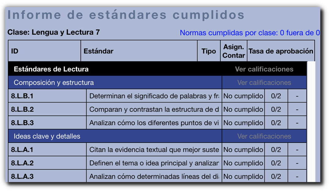El reporte de "Estándares cumplidos: todas las clases" permite a los maestros ver fácilmente la siguiente información sobre sus propias clases: