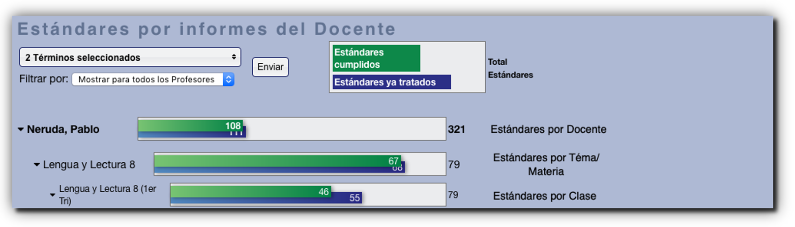 Una vez que el informe termine de procesarse, mostrará una lista de cada clase impartida por el profesor/docente en el (los) término (s) seleccionado (s), así como una gráfica que muestra la cantidad de estándares cumplidos e intentados.