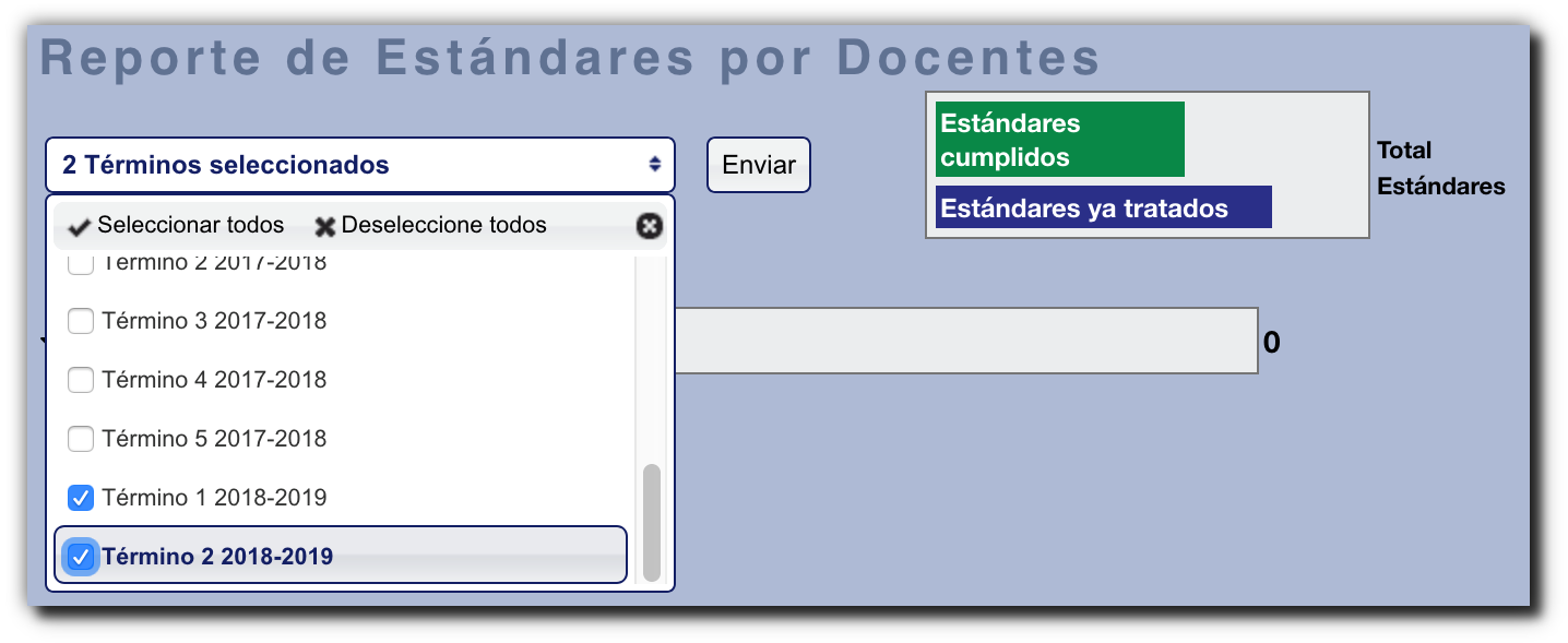 Para ejecutar el reporte, los profesores seleccionan uno o más Términos del menú desplegable a la izquierda. Luego presione el botón Enviar: