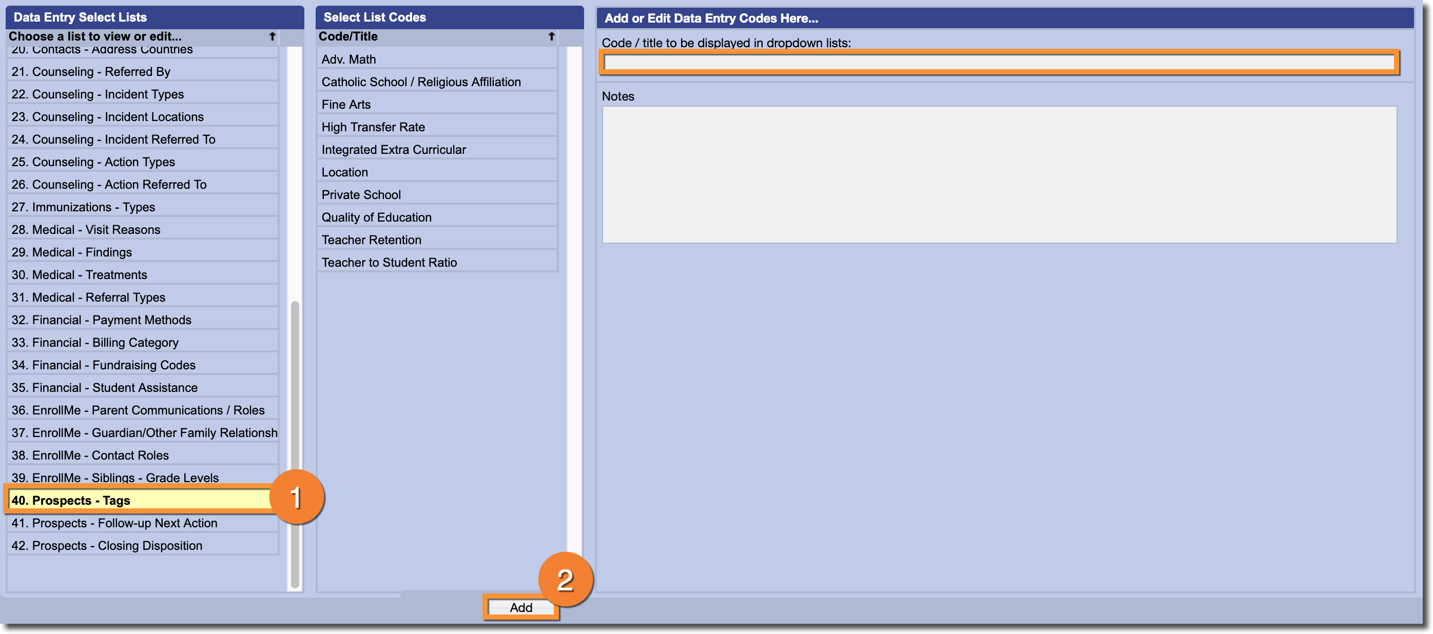 Using the Coding menu, located in the Students tab, Administrators can create their own default values for the Tags, Next Follow-Up Action, and Closing Disposition menus that appear in the Prospects Workflow.