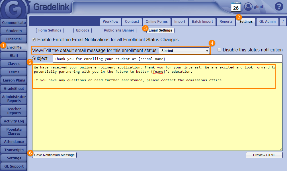 6. Click the Save Notification Message button at the bottom left corner of the page when you are finished with your changes.