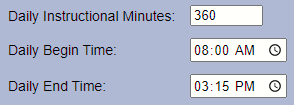 The default Daily Settings include how many instructional minutes occur each school day as well as what time each school day begins and ends: