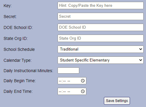 The DOE School ID is usually the same as the last 10 characters of the Key with one difference: if your Key contains a letter in the last four characters, replace that letter with its alphanumerical equivalent. For example, if the last four characters of your Key are "C395", then in the DOE School ID field you would enter "3395" because "C" is the third letter in the alphabet.