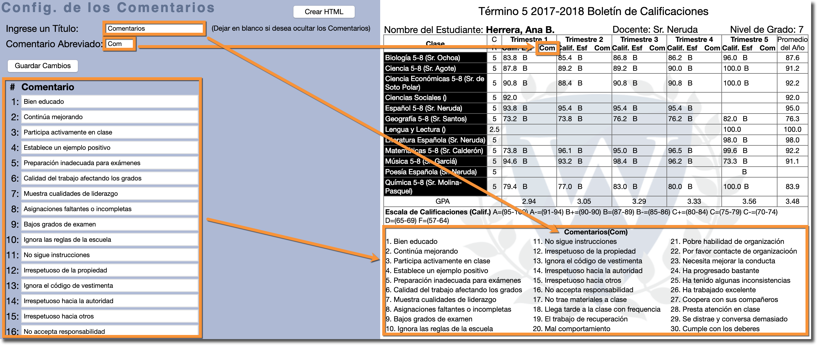 Los comentarios enumerados utilizan una lista numerada de predefinidos y permiten a los maestros registrar información sobre el esfuerzo o comportamiento de un estudiante que puede o no estar reflejado en su calificación. La lista de comentarios debe ser configurada previamente por los Administradores de su Escuela, y solo los administradores completos pueden habilitar y personalizar esta configuración.