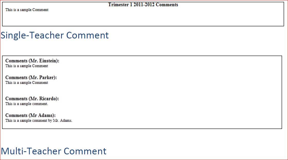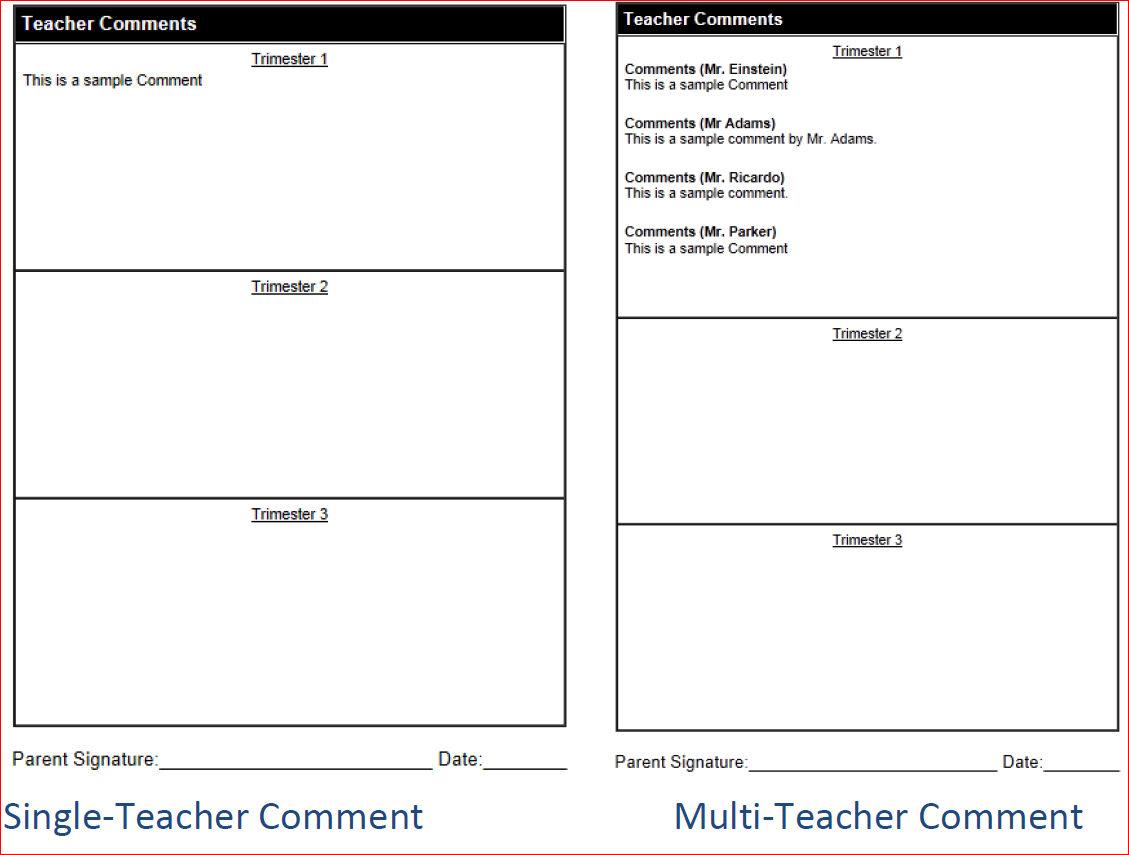 A continuación, incluimos varios ejemplos que demuestran cómo aparecerán los comentarios en los distintos boletines de calificaciones.