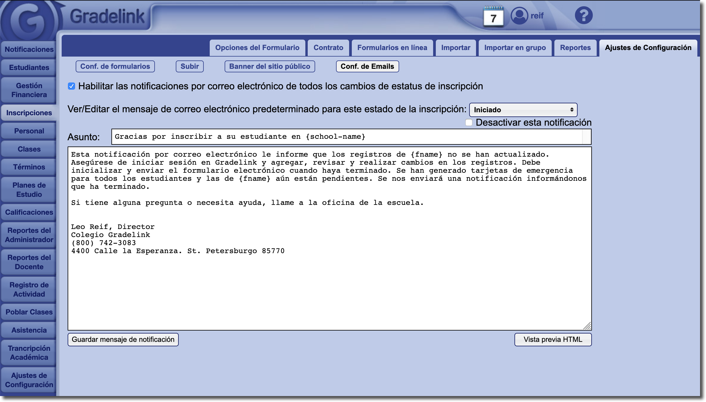 • Gradelink le permite a un administrador modificar los estados que enviarán correos electrónicos automáticos, así como el contenido.