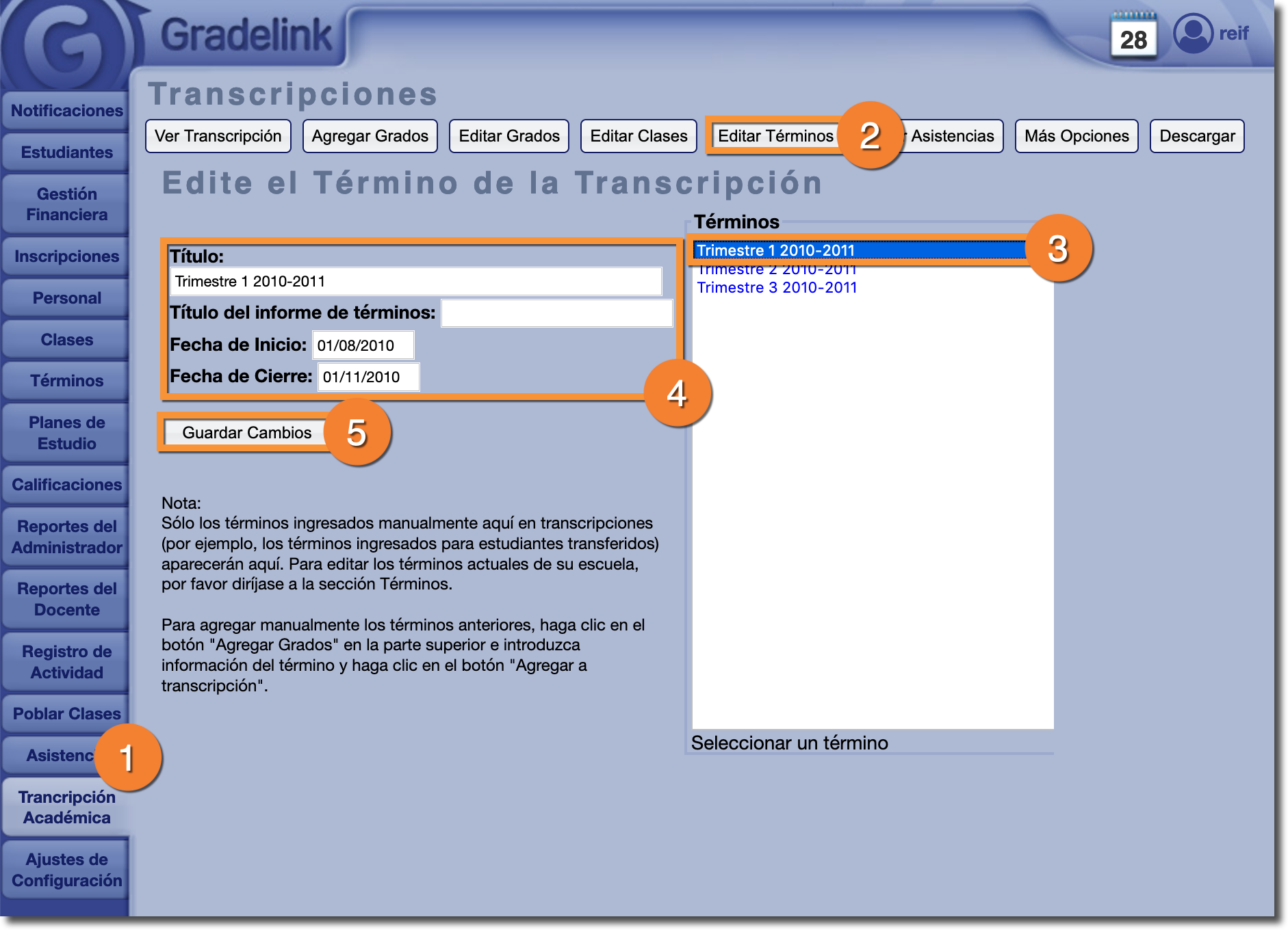 Gradelink permite a los administradores realizar ajustes a los términos utilizando la pestaña Transcripción Académica.