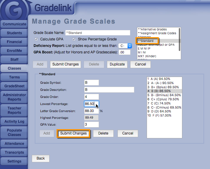 7. The Lowest Percentage value determines the lowest possible percentage a student must earn to receive that grade. This is required even if "Show Percentage Grade" is left unchecked, and does not necessarily mean that a percentage grade will appear. The percentage value entered is used by Gradelink to average Grade Symbols based on assignment grades. To enable rounding on assignments and overall grades, enter half a percent lower that the desired value.  For example, if an "A" is worth 90-100%, but  rounding is desired, 89.5% should be entered into the Lowest Percentage field, and the grade will round up to a 90%.