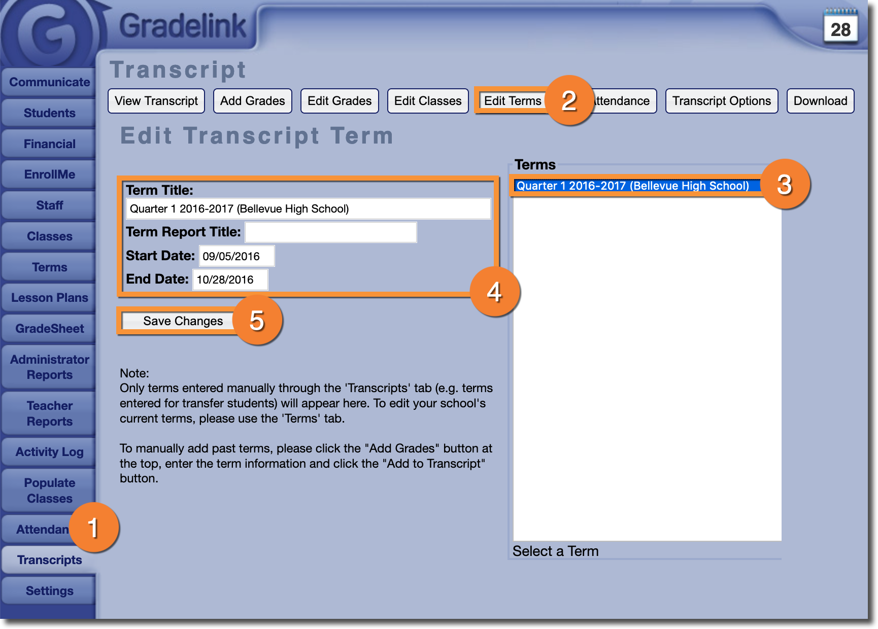 Gradelink allows Administrators to make adjustments to terms using the Transcripts tab. However, it's important to note that this only applies to transcript-only terms - terms that were created while manually adding grades to the transcript. If an Administrator would like to make adjustments to other terms, they can do so directly through the Terms tab.