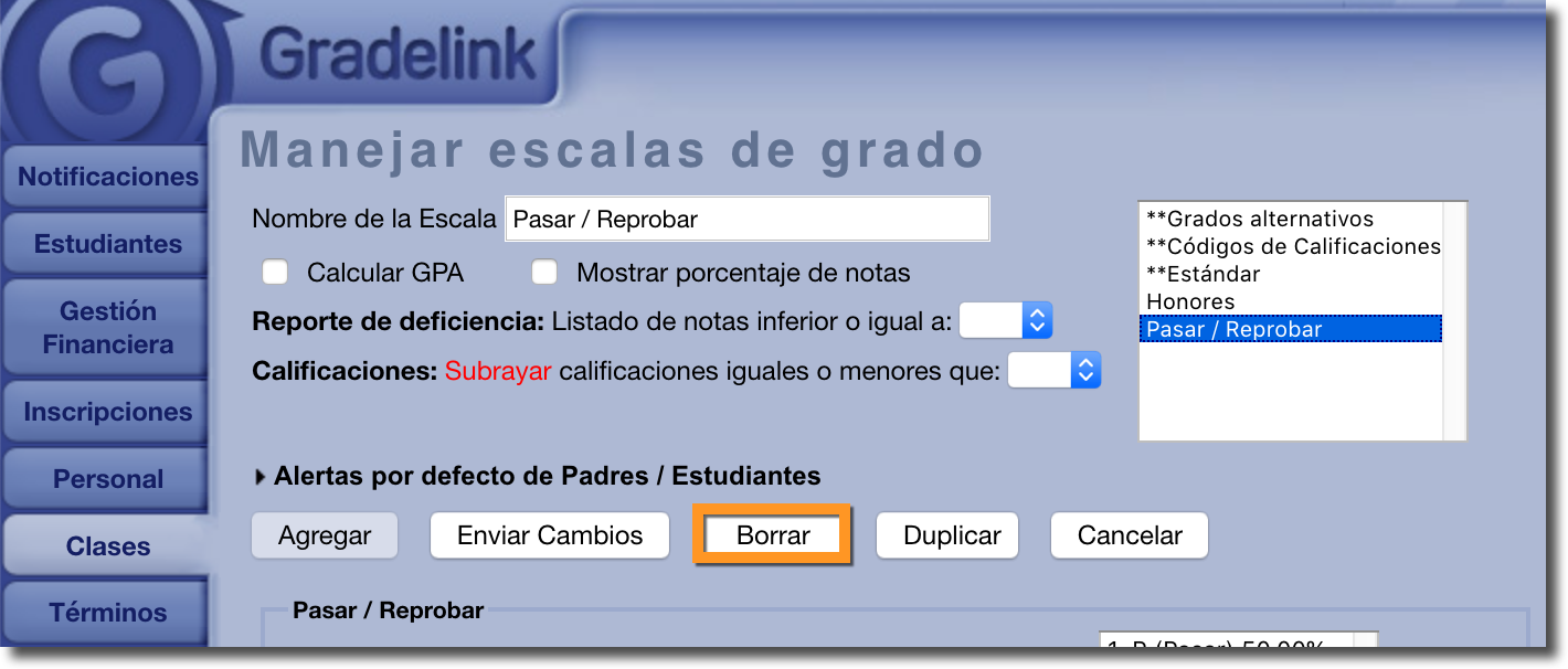IMPORTANTE: Si la escala de calificación está asociada a una clase, no le permitirá borrarla. Deberá eliminar la clase / clases primero y disociarla antes de poder eliminarla.