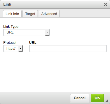 - A new window will appear prompting you to enter the URL you’d like to link to. Type your URL in the text box labeled "URL". For now, we don't need to worry about the "Link Type" and "Protocol" fields.
