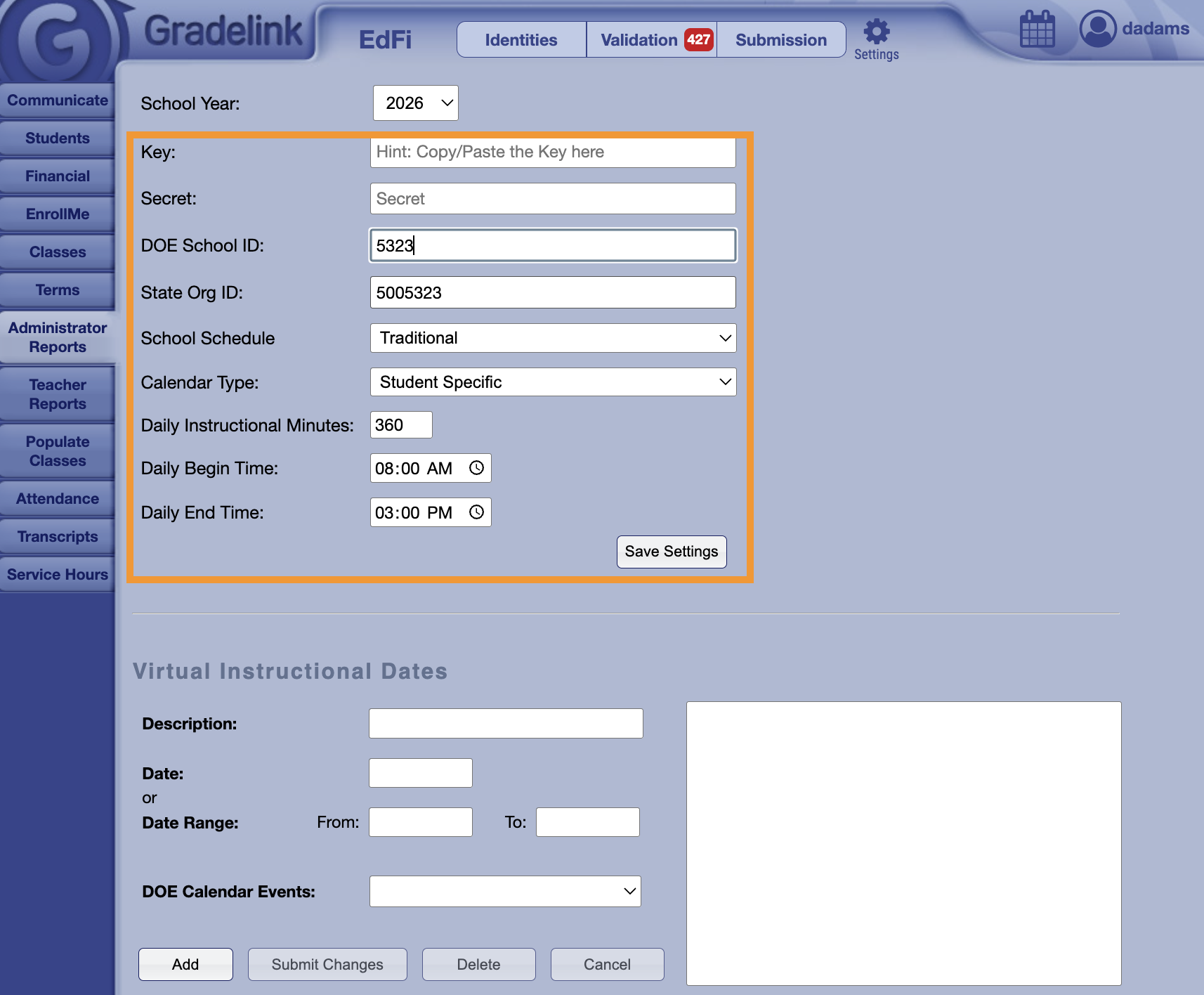 Enter your school's WISEdata School Year, Key, Secret, DOE School ID, and State Org ID (LEA). Select other options that may apply to your school and Save Settings.