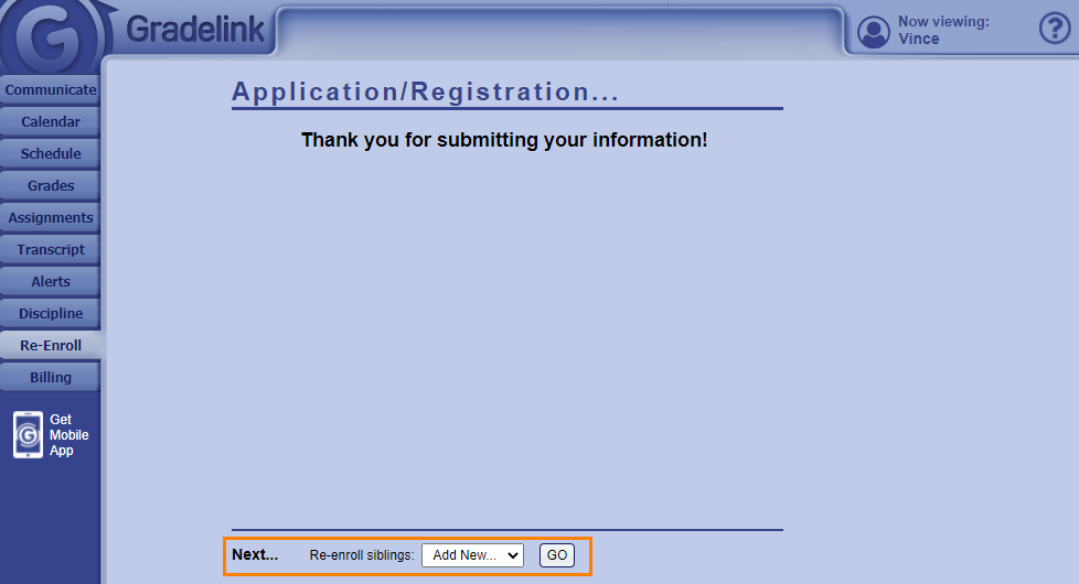 3. After re-enrolling a current student, they will click the drop-down menu below the enrollment screen and either choose Add New, where they will then follow the steps outlined in Enrolling a New Student, or select another sibling currently in the school, in which case the screen will then switch over to other siblings re-enrollment application for re-enrollment.