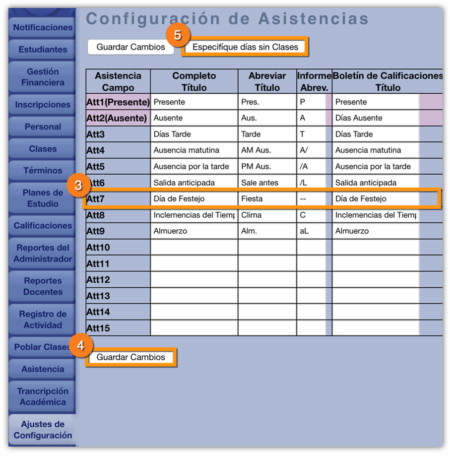 Nota : Cualquier marca utilizada en "Especificar días no escolares" DEBE tener marcada la casilla "Asistencia excluida" o, de lo contrario, los cálculos de asistencia serán incorrectos.