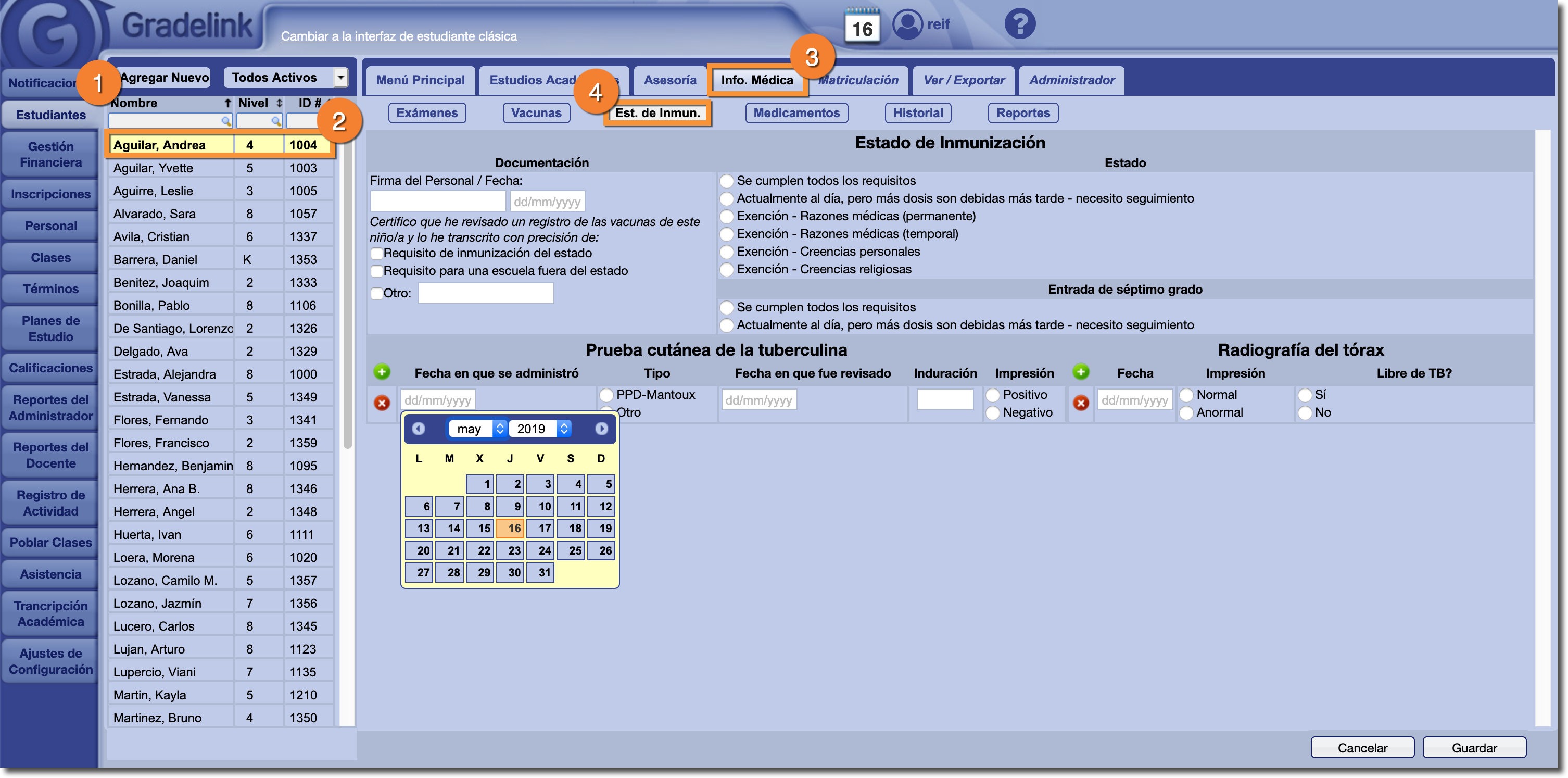En la página Estado de Inmunización, puede documentar requisitos estatales comunes con respecto a las vacunas de los estudiantes. Esto incluye permitir que un miembro del personal firme digitalmente después de transcribir los documentos, marcar si un estudiante está actualizado o exento, así como resultados específicos para pruebas de tuberculina y radiografías del tórax.