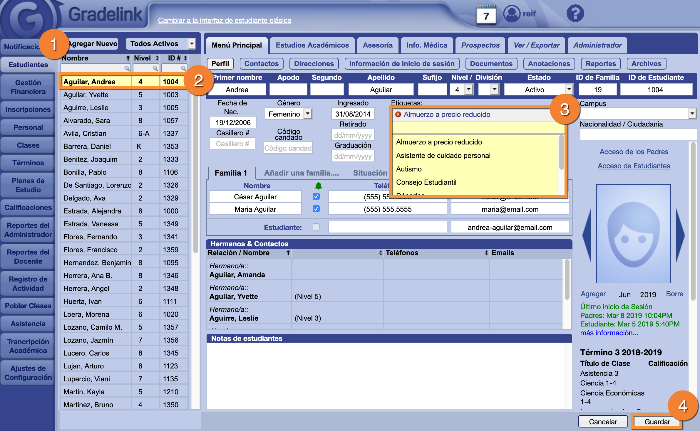 - Seleccione el estudiante al que desea agregar etiquetas