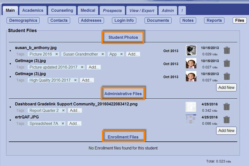 1. Student Photos: Pictures uploaded here will display in the Photo/Picture section of the student's demographics with the most recent photo first (you don't need to delete old photos to update them, just upload the new one).