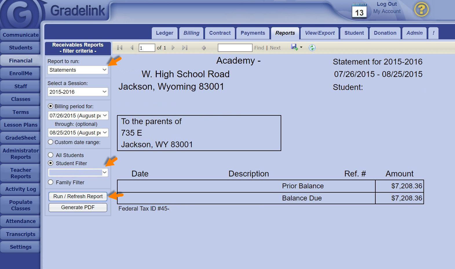 Under “Report to Run”, specify the type of report you want to run. Select the session for which you are running the report. You will also need to select a billing period for the report from the drop down box below the words “Billing period for”. Select the billing period for which you would like to run the statement. Determine whether you want to print for an individual student, all students, or a family. Then choose run/refresh report which will generate the report for you. If you elected to run statements for multiple students, you can navigate to the next statements using the forward and back arrows (above where the school address displays). You can also click on the picture of the blue floppy disk to export the statements to PDF, Microsoft Word, or Excel. You can then email the statement to parents, or print out a hard copy for distribution.