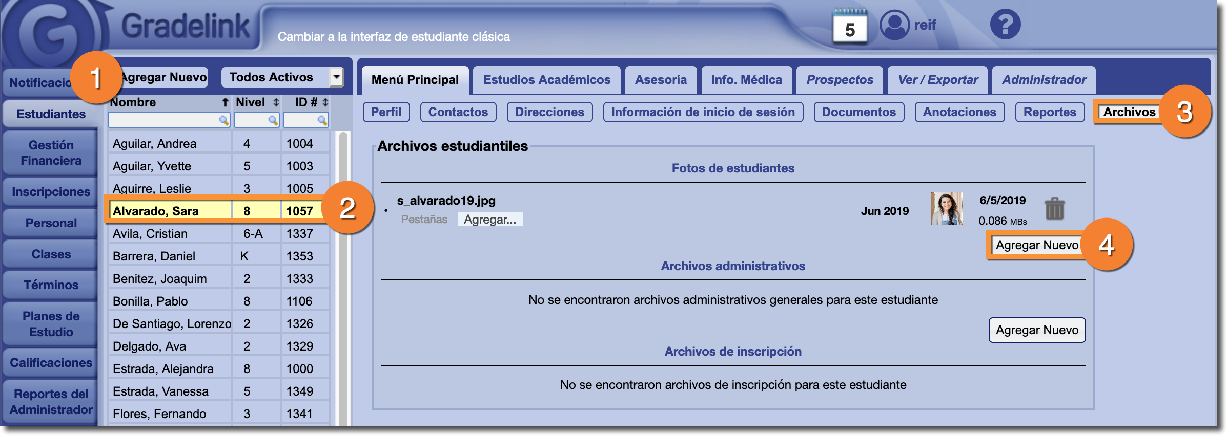 Hay dos formas de agregar fotos de estudiantes en Gradelink: a través de la página de Perfil o de la página de Archivos.