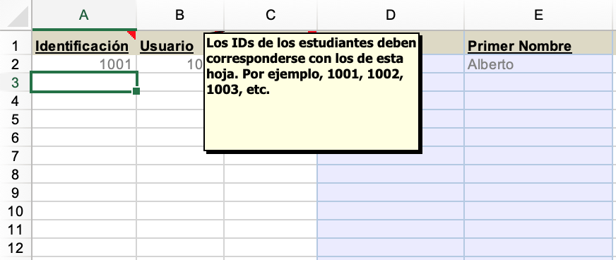 El tipo de datos y un ejemplo del tipo de datos se proporcionan como un comentario en cada nombre de columna. Pase el mouse sobre el encabezado de la columna para ver el comentario.