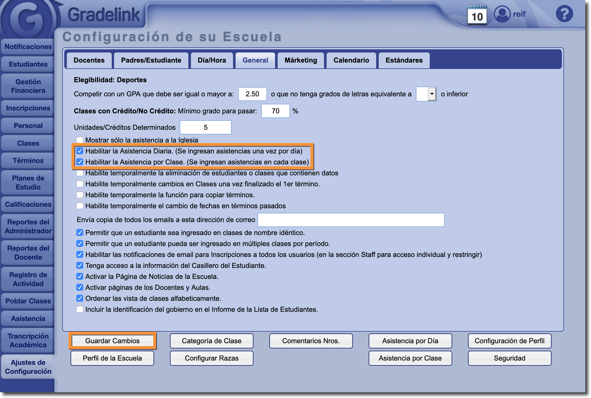 Nota: Es posible tener tanto la Asistencia escolar como la Asistencia a clase activas (o inactivas) al mismo tiempo.