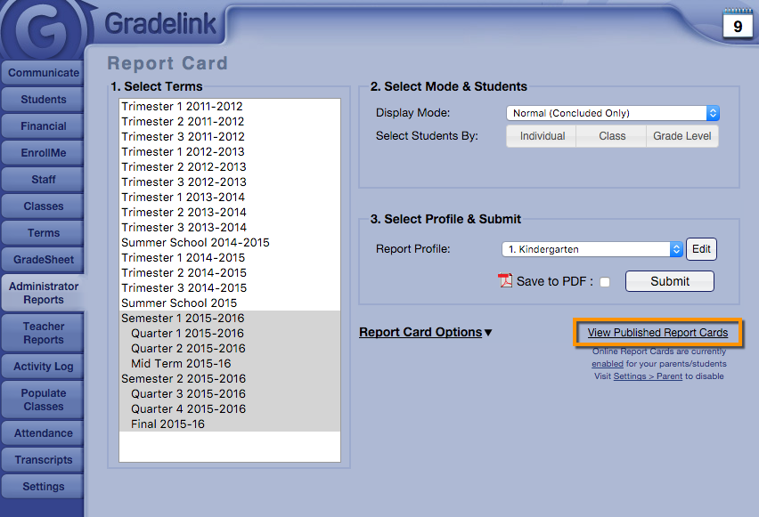 How can I view published Report Cards?